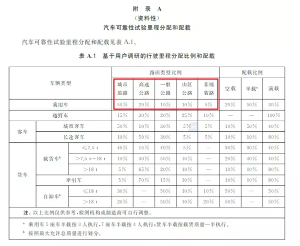 所以如果后面国标更新,这个审查的标准也就跟着变了。 我们再看第二个问题: 跑 3 万公里试验就够了吗? 直接说结论,3 万公里确实不算很高的标准,很多车企自家标准都高于这个,但它也不低。 可靠性试验有个初衷是,尽可能贴近用户实际使用的场景。比如在可靠性国标里,给出了一个基于用户调研的行驶里程分配比例。 拿乘用车来说,55%的使用场景是城市道路,20%是高速公路,只有 5%是非铺装路。