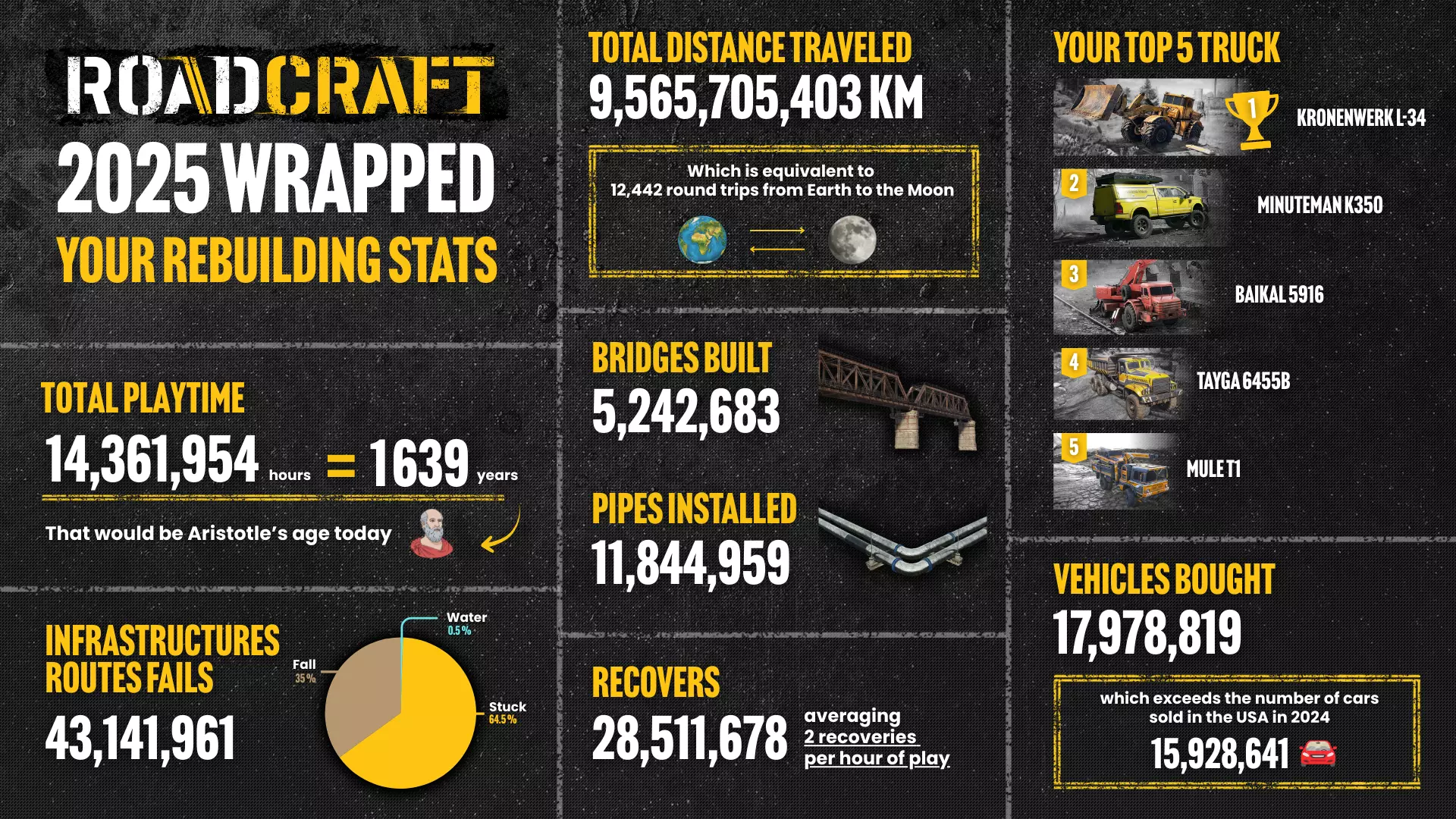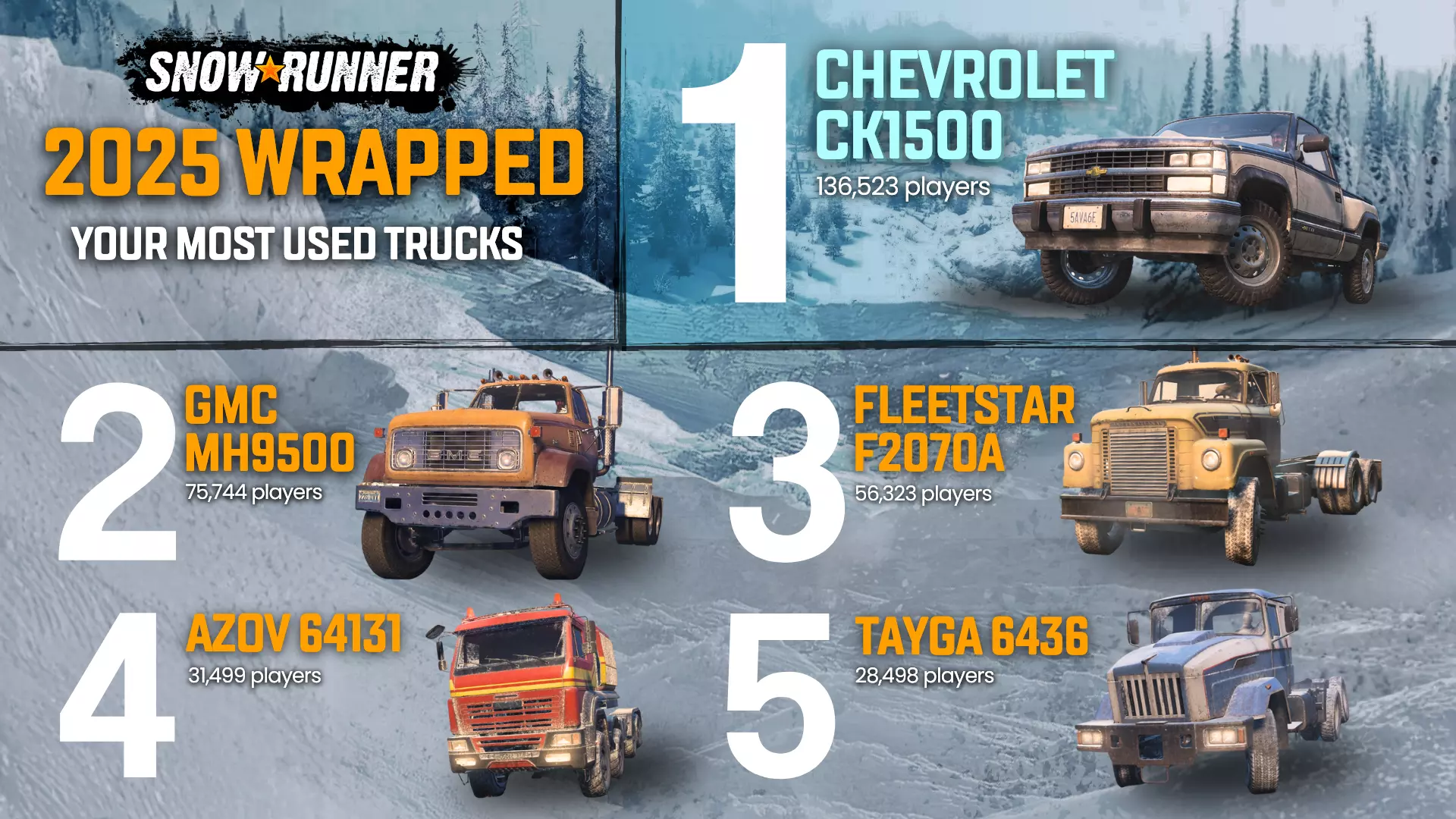 试玩版现已在全平台(Xbox Series、PS5及Steam)上线!以下是试玩版内容: 1. 探索前两张地图:Precipice与Aftermath 2. 解锁并测试15辆载具,每辆都有独特优势 3. 支持4人组队合作(仅限试玩版之间),且支持跨平台游玩 4. 无时间限制自由畅玩,升级至完整版游戏可保留进度 无论你是单人游玩还是与好友组队,都有丰富内容等待探索,升级完整版后你的游戏进度将无缝延续。2025年对于我们的卡车模拟游戏来说意义重大✨ 《雪地奔驰》凭借其第四年季票持续保持热度,带来了四个全新赛季以及多个独立DLC,当然,这也意味着大量超棒的新卡车。 《越野远征》也以四个精彩赛季圆满结束了一段不可思议的旅程,完美收官其第一年季票。 我们于5月推出了《道路建造师》,为全球玩家带来了终极重建冒险体验。 当然……我们还公布了《公路之王》,这是我们的下一个重大项目,它已经逐渐成为一段超棒的旅程! 感谢您参与所有这些冒险。您的支持、投入以及对卡车的热爱,每天都在真正激励着我们。随着今年接近尾声,我们想分享《公路狂飙》和《雪地奔驰》的2025年度回顾,其中包含了来自各位玩家的精彩数据。一起来看看吧!
