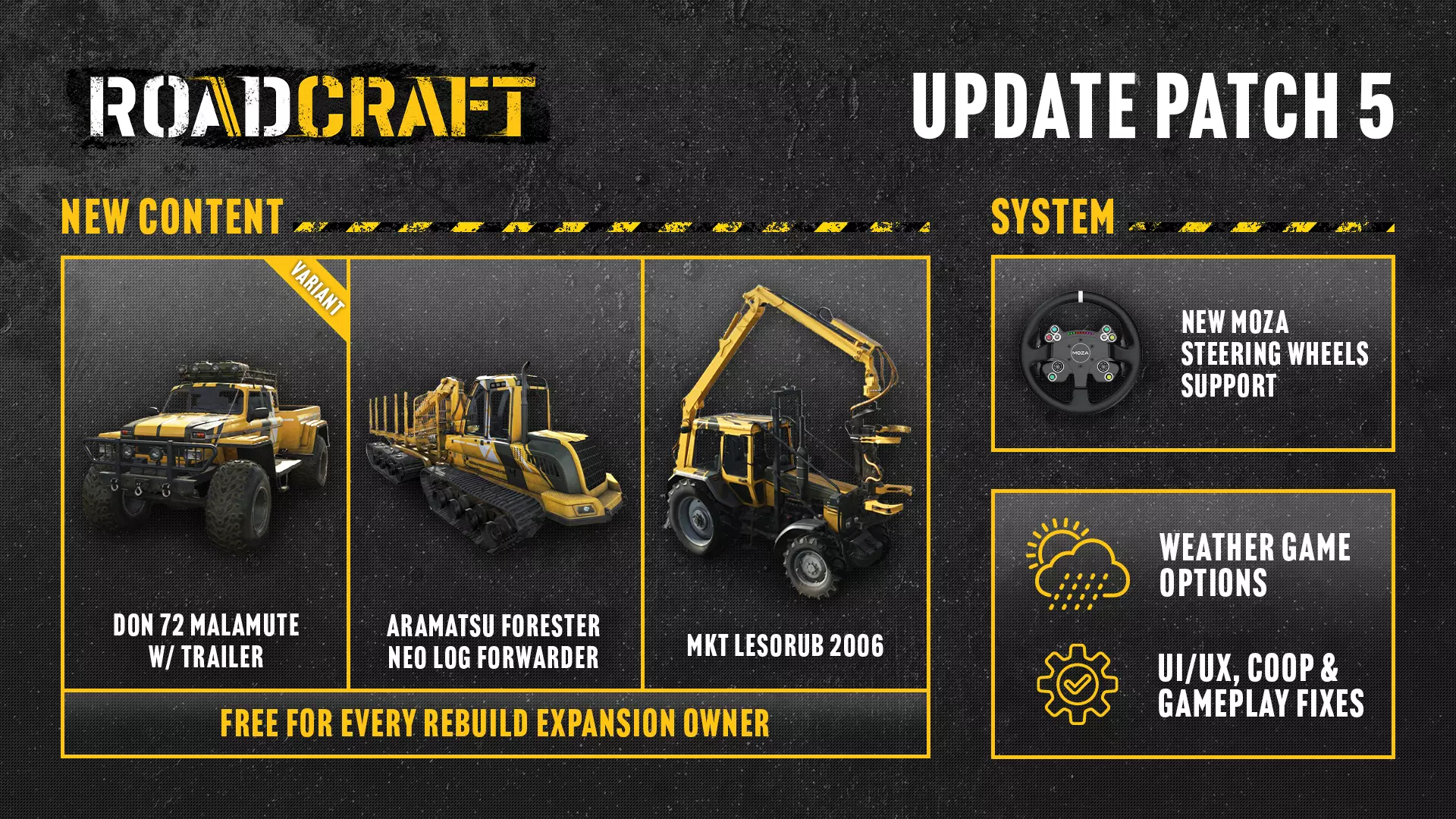 《ROADCRAFT》更新及DLC相关说明 首先,我们要为更新、DLC和试玩版的延期表示歉意。 情况说明:由于一张地图(Contamination)上的一个bug导致存档损坏,我们不得不回滚所有内容。虽然并非所有人都受到影响,但考虑到风险,全面回滚是必要的。 好消息是,从本周二开始,大家都可以获取更新、Timberworks Pack以及免费试玩版了! 【Timberworks Pack详情】 全新DLC现已推出,所有拥有Rebuild Expansion的玩家可免费获取。若尚未拥有该扩展包,可单独购买。 此DLC包含3辆全新载具: Don 72 Malamute——紧凑、可靠且灵活性惊人。自带拖车,能在最狭窄的森林小径中穿梭,实现精准运输。MTK Lesorub 2006——你的伐木主力。这款拖拉机内置采伐机,可像专业人士一样进行伐木、修剪和木材加工。 Aramatsu Forester Neo Log Forwarder——森林中的真正巨无霸。轻松抓取、搬运和运输原木,即使是最艰巨的林业作业也能顺利完成。