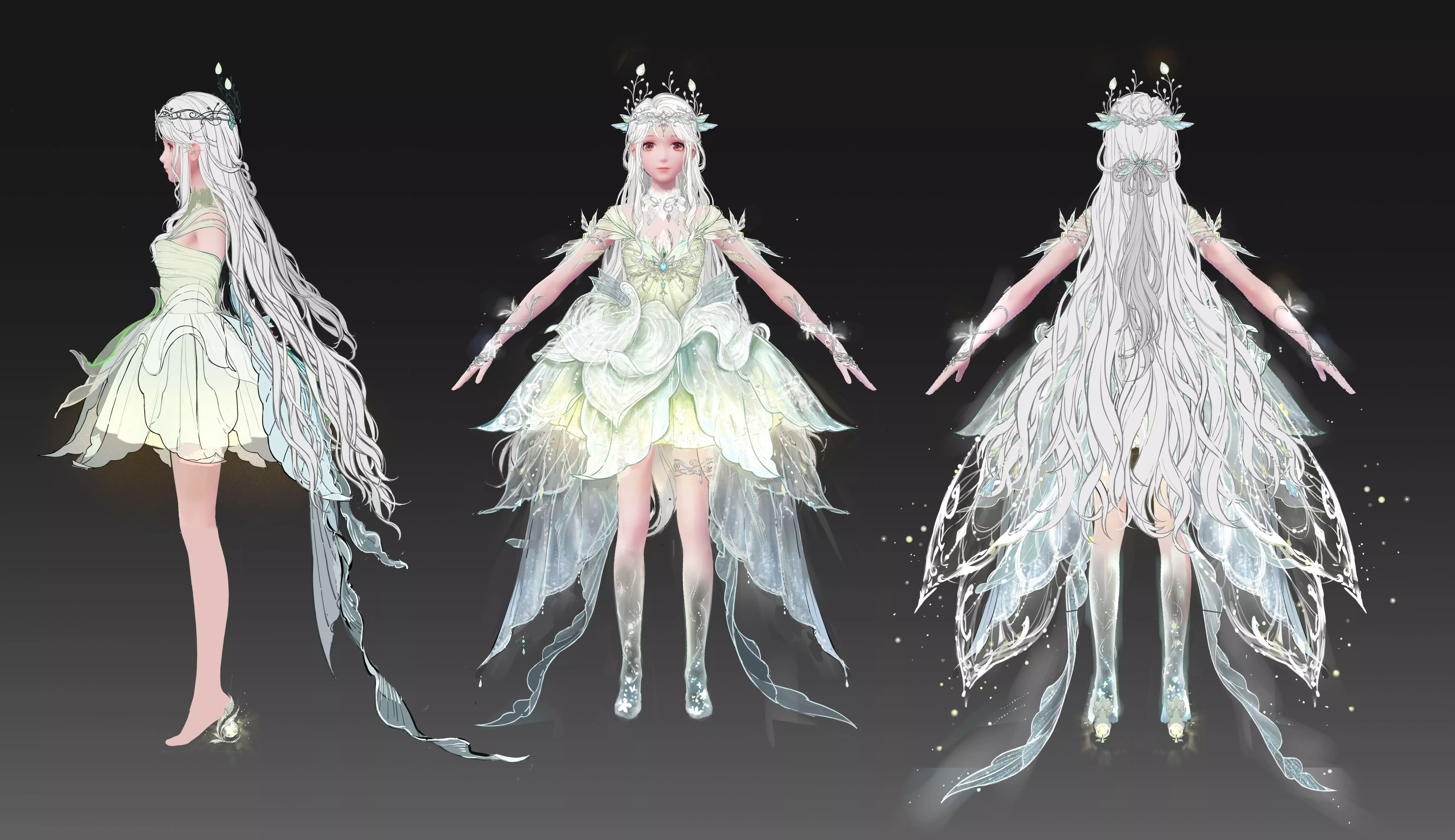 【晨曦初露之裙】 此裙采用浓郁的绿色调,其轮廓设计旨在展现被树叶环抱的自然精灵般的柔美优雅。树叶图案从肩部延伸,在胸前汇聚,顶部镶嵌着一颗深蓝色宝石。灵感源自树枝与翅膀的银色装饰,增强了裙子轻盈飘逸、空灵超凡的质感。 裙摆处的薄纱层模拟卷曲交叠的树叶,既保留了森林精灵服饰常见的自然纯净感,又提升了设计的优雅与精致。裙边的灵感来自萤火虫,带有发光的黄色点缀,仿佛捕捉到了它们在暮色中轻盈飞舞的姿态。在后方,飘逸的叶群和闪烁的半透明翅膀,唤起了精灵在森林中轻盈飞舞的活泼奇幻之灵,成就了这既精致又迷人的设计。
