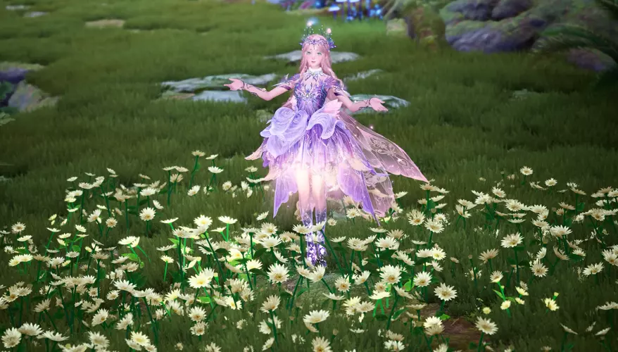 技能设计理念 若用一句话概括这套服装技能的设计灵感,那便是“步步生花”。当萤火虫精灵穿梭于森林中,脚下的青草与树叶会温柔地分开,小径上绽放出朵朵小花。这让人联想到无数萤火虫在其周围飞舞,如同夜空中摇曳的柔和光点。这份美不仅停留在视觉层面,在技能范围内,它允许对植物进行一次性采集,同时促进植物再生,生动体现了“生命不断成长与更新”这一设计核心主题。