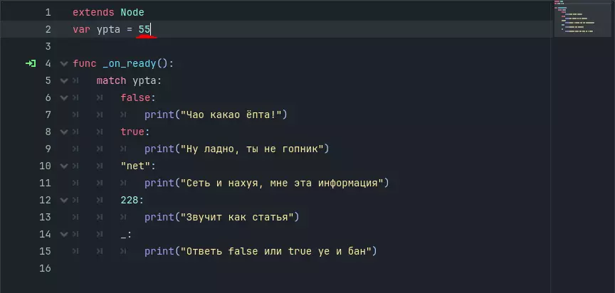代码说明 extends Node - 继承节点 var ypta = 55 - 声明变量ypta并赋值55(可以修改,接下来用通俗的语言解释一些内容) func _on_ready(): - 基础函数,当程序运行时执行该函数内的其余代码 match ypta: - 指定要检查的变量(在这种情况下,Switch-Case将检查变量ypta) false: - (如果变量的值等于false,则执行此代码) print("Чао какао ♥♥♥♥!")") true: -(如果变量值等于true,则执行此代码)print(“好吧,你不是小混混”)“net”:-(如果变量值等于net,则执行此代码)print(“网络什么的,这信息我不感兴趣”)228:-(如果变量值等于228,则执行此代码)print(“听起来像篇文章”)_:-(如果变量值不属于上述任何一种,则执行此代码)print(“回答false或true,否则封禁”)用通俗的话解释 Switch-Case 会获取检查变量ypta并与条件进行比较:如果变量等于false,控制台将显示消息【Чао какао ♥♥♥♥!】如果变量等于true,控制台会显示消息“好吧,你不是小混混”。如果变量等于net,控制台会显示消息“网络什么的,我不需要这个信息”。如果变量等于228,控制台会显示消息“听起来像篇文章”。如果变量与任何条件都不匹配,控制台会显示消息“回答false或true,否则封禁”。也就是说,_:-这就相当于普通switch-case中的default。如果你了解Switch-Case,这里有几个建议:用match替换switch。删除case。 删除所有break。 将default替换为下划线。 4. 结尾 该说的都说了,就这样结束吧。关于还需要写什么指南,可以提出来。