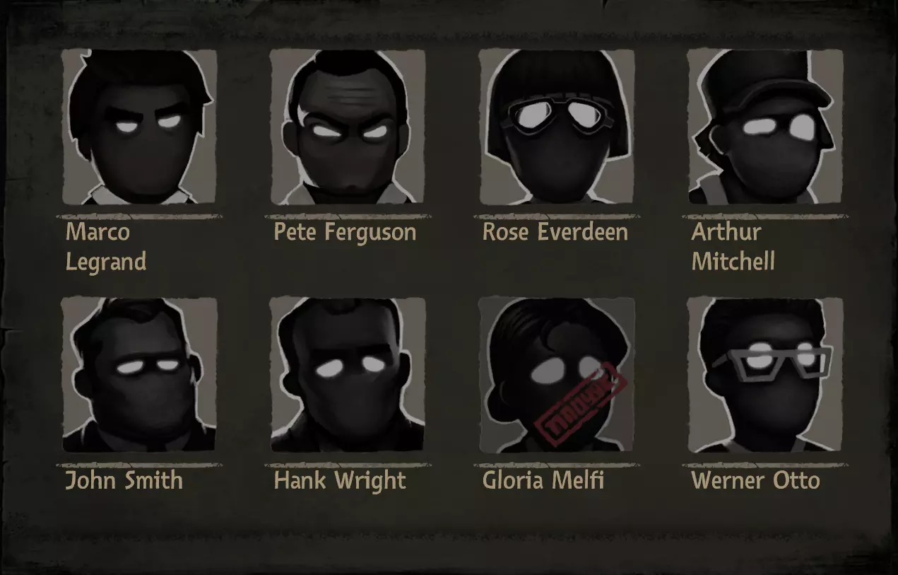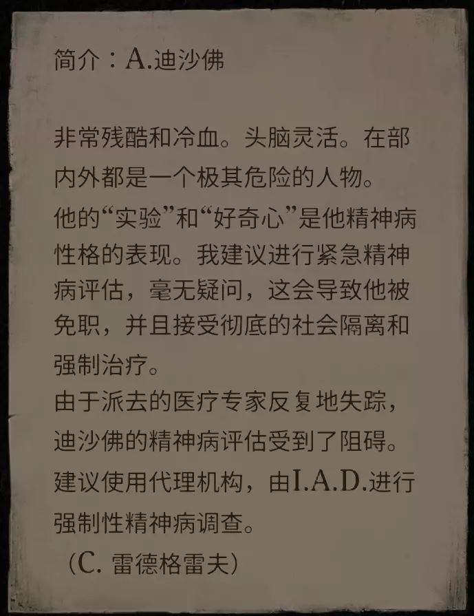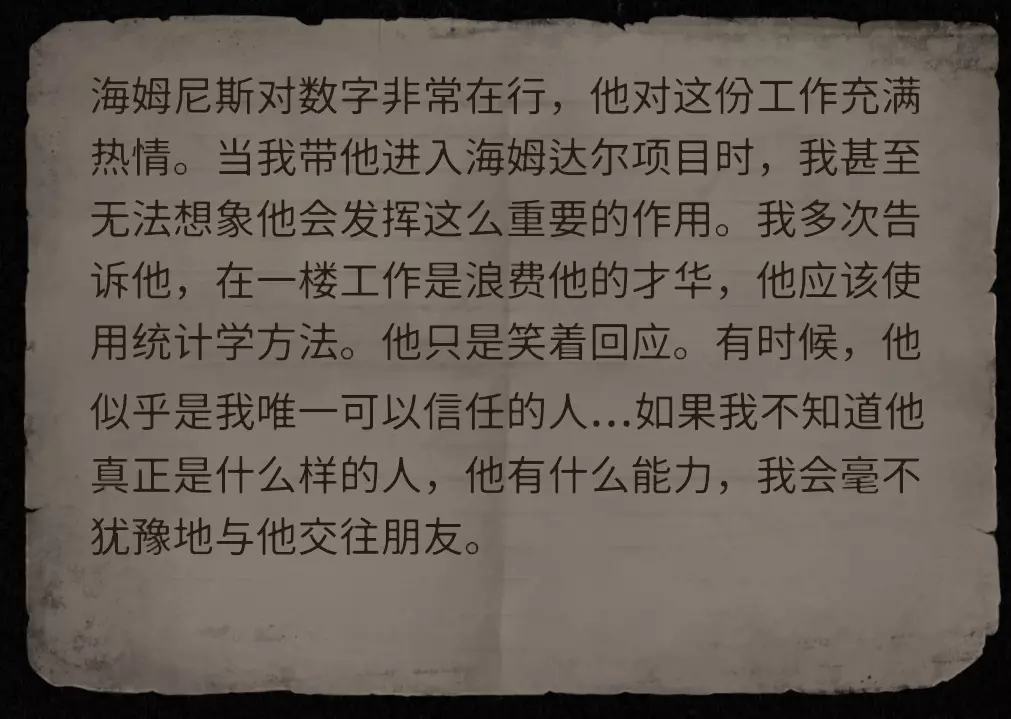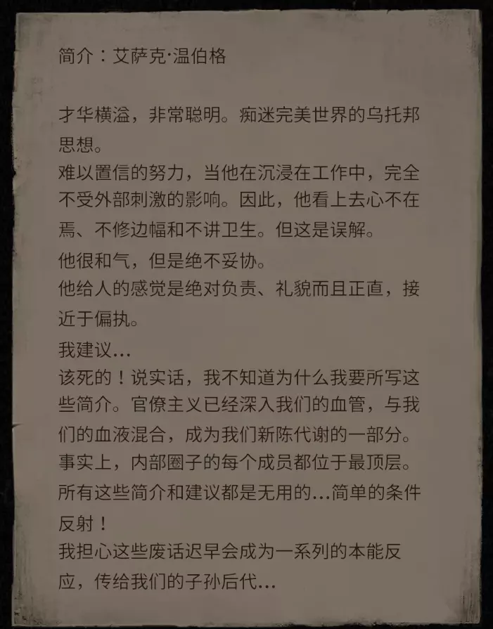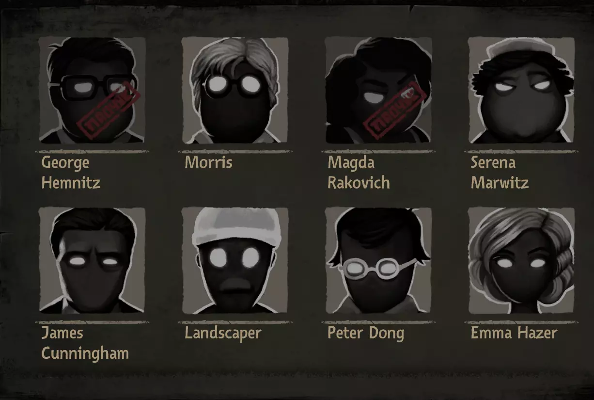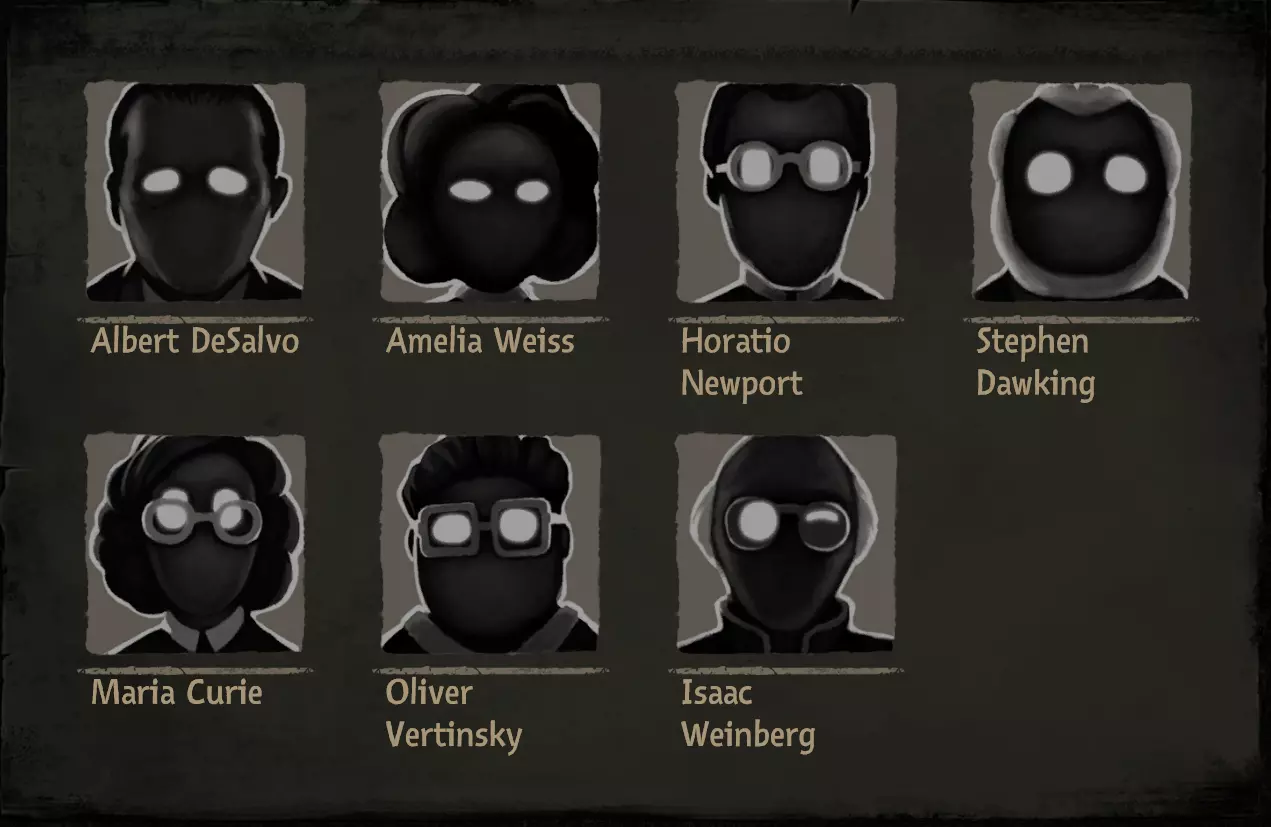 姓名 年龄 说明 乔治·赫姆尼茨 35 毫无疑问的大魔头 莫里斯 47 霸凌对象 玛格达·拉科维奇 48 女儿永远是她的痛 塞雷娜·马维茨 50 就是卖吃的大婶 詹姆斯·坎宁安 50 死的不明不白的 园丁 40 抓虫子的 彼得·董 29 由你决定他上天堂还是下地狱 艾玛·黑泽 28 办公室之花 马可·勒格朗 27 一肚子坏水,被宠坏的富家子弟 罗丝·埃弗丁 33 以工作为乐趣的 亚瑟·米切尔 32 被女友劈腿的约翰·史密斯 43 冒牌货 汉克·赖特 40 没有一天清醒的 格洛丽亚·梅尔菲 40 我儿子还活着!! 维尔纳·奥托 32 沉醉于碎纸机 艾伯特·德萨尔沃 60 死变态 阿米莉亚·魏斯 25 正!霍雷肖·纽波特 20岁 年轻气盛、目中无人、心高气傲、狂妄自大 斯蒂芬·霍金 53岁 很好相处的人 玛丽亚·居里 25岁 可怜的女科学家,记得让她脱离苦海回到自己的国家 奥利弗·韦尔廷斯基 35岁 技术人员 艾萨克·温伯格 53岁 科学怪人
