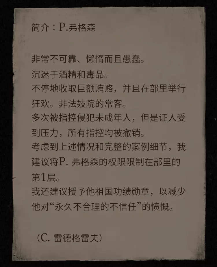 速度太快的话可以调慢一点~ 12楼的难度确实会让人超级崩溃,但相信你会习惯的~它可以单独保存一个档案,这点很贴心呢~ 1. 规则每隔几天会更换一次,要注意留意它给你的规则。 2. 印章盖错了可以重来。 3. 有时候一个单据可以盖三到五个印章,要看清楚哪些印章是相关的。 4. 如果没有符合规则的印章,就可以随便盖。 5. 我觉得你还是一个单据存一个档比较好,时间久了你就习惯了~ 25楼的内容让我直接翻白眼。 这部分其实就是考验你的数学能力,但也没那么严重,只要点亮三个灯就可以过关了,灯越多钱也越多~ 收集地点!一定要收集齐全!1楼老板办公室的保险箱、电脑、抽屉 你的三位同事董、艾玛、马可的电脑和抽屉 秘书的电脑书桌(需要完成孙女任务才能看到,去手推车找资料夹!没找到就隔天搜索!一定会有) 外面的三台手推车 大婶的餐车 排队区的贩卖机(前提是接取大婶的拆卸贩卖机任务) 花圃的三盆花(在刑场那边) 守卫室的架子(同事离开后东西都放在那里!没事就去搜索) 12楼变态老板的密室里有手推车和柜子 当然不能忘了老板的抽屉和电脑 大门外面的书柜 你的三位同事的电脑与抽屉 25楼同样有老板和同事的电脑及抽屉手推车在卡尔复制人那边。电脑里的东西每样都要查看,会得到一些信息。当你搜集到所有的信件后,密码应该是225之类的。我当时以为自己漏了什么,又去搜了一遍,结果意外地在警卫的架子上找到了,我就搜集完了?神奇的是前一天架子我才搜干净而已,所以我觉得信件找齐是关键吧?1楼