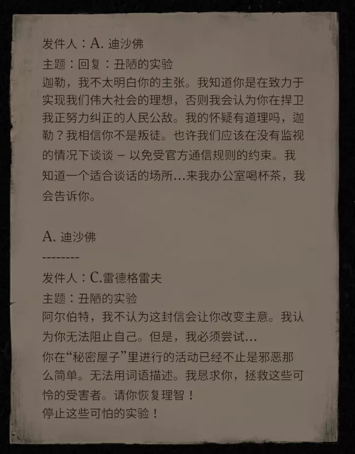 火箭装置 1楼装置:小贩车、贩卖机、电话亭、警卫室、三座领袖 12楼装置:喷水池两座、电话亭 25楼装置:无 清洁测试:打电话接受清洁测试,只要是领袖都按!有几题比较特别,像是【刀子的背面:异端】。 未来人:会有一个自称是未来的人,要求主角更正错误,注射五个卡尔(办公室外面那五个)并修改电脑程序,去中间那位同事的电脑上选择B选项即可! 卡尔实验:玩过一代的人应该会知道故事内容,去外面调查的时候也会再复习一次答案。1.儿子没上大学去了矿场工作 2.女朋友叫安德莉亞·高基克 3.妈妈要卡尔去找药 4.妈妈很早之前就离开你 5.女儿的娃娃奈拉 6.曾经允诺要给女儿糖果 7.我里面有一颗太阳 8.席默尔送了一本书供我学习 生物辨识箱与信息全图 信件