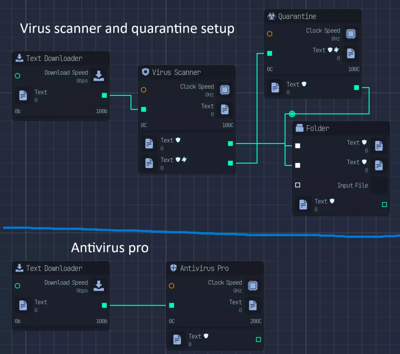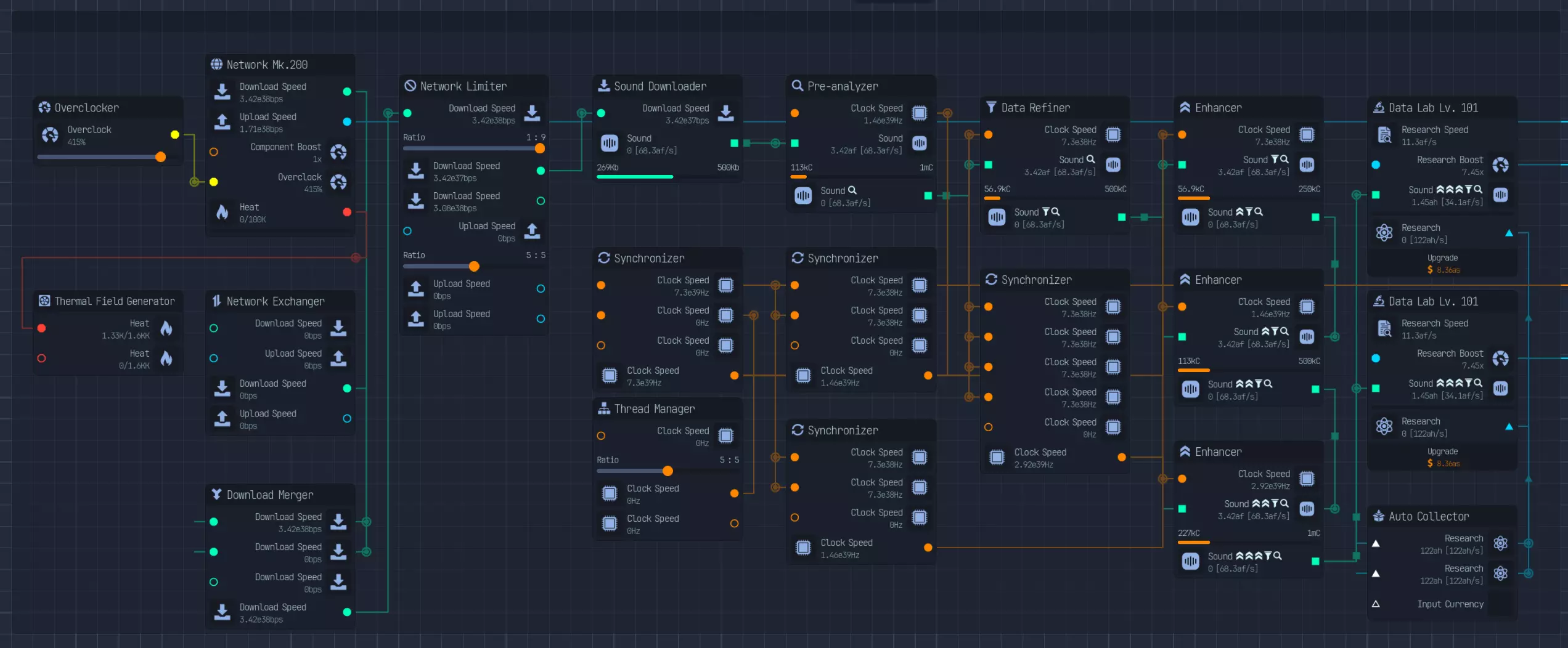 研究布局 研究是游戏的重要组成部分。以下是我在整个游戏过程中使用的布局。 布局从第二个网络节点开始,将所有网络速度转换为下载速度,并使用限制器控制下载用量。这是因为大多数情况下,下载速度快于数据实验室的研究速度。 网络限制器的第二个输出用于与第一个网络节点结合,以下载其他文件(用于上传或人工智能)。 下载的文件会经过预分析、数据精炼和增强处理,以实现每个文件的最大研究点数。