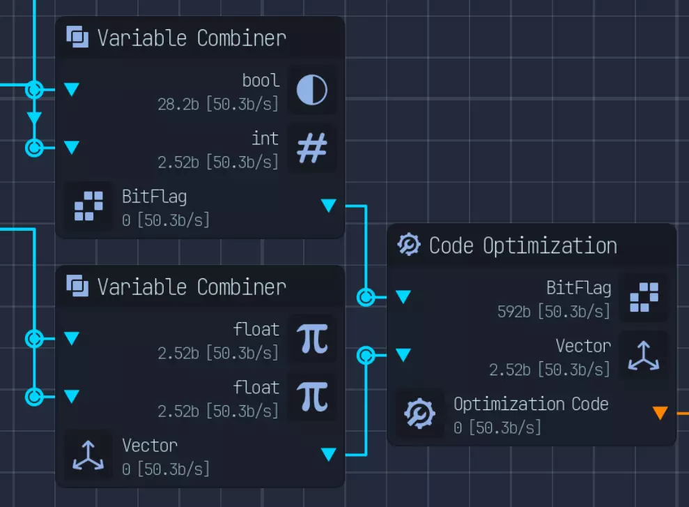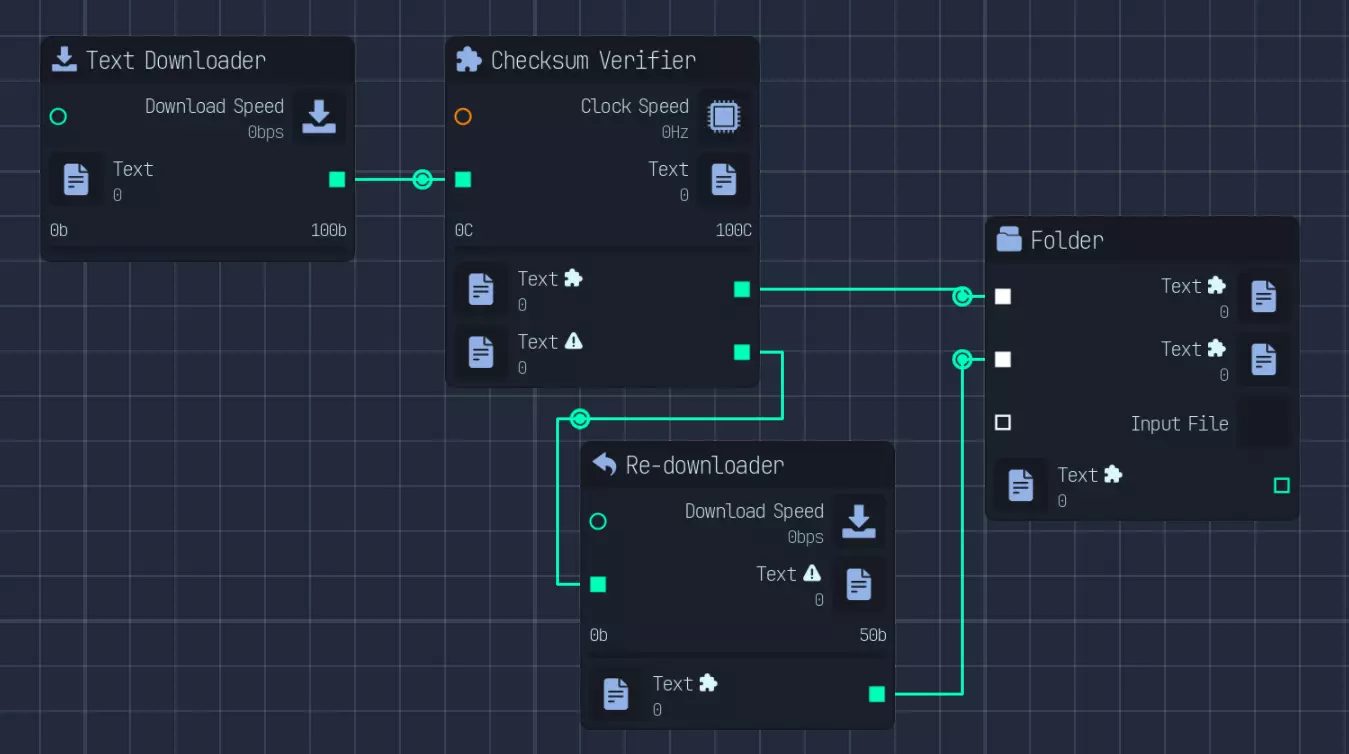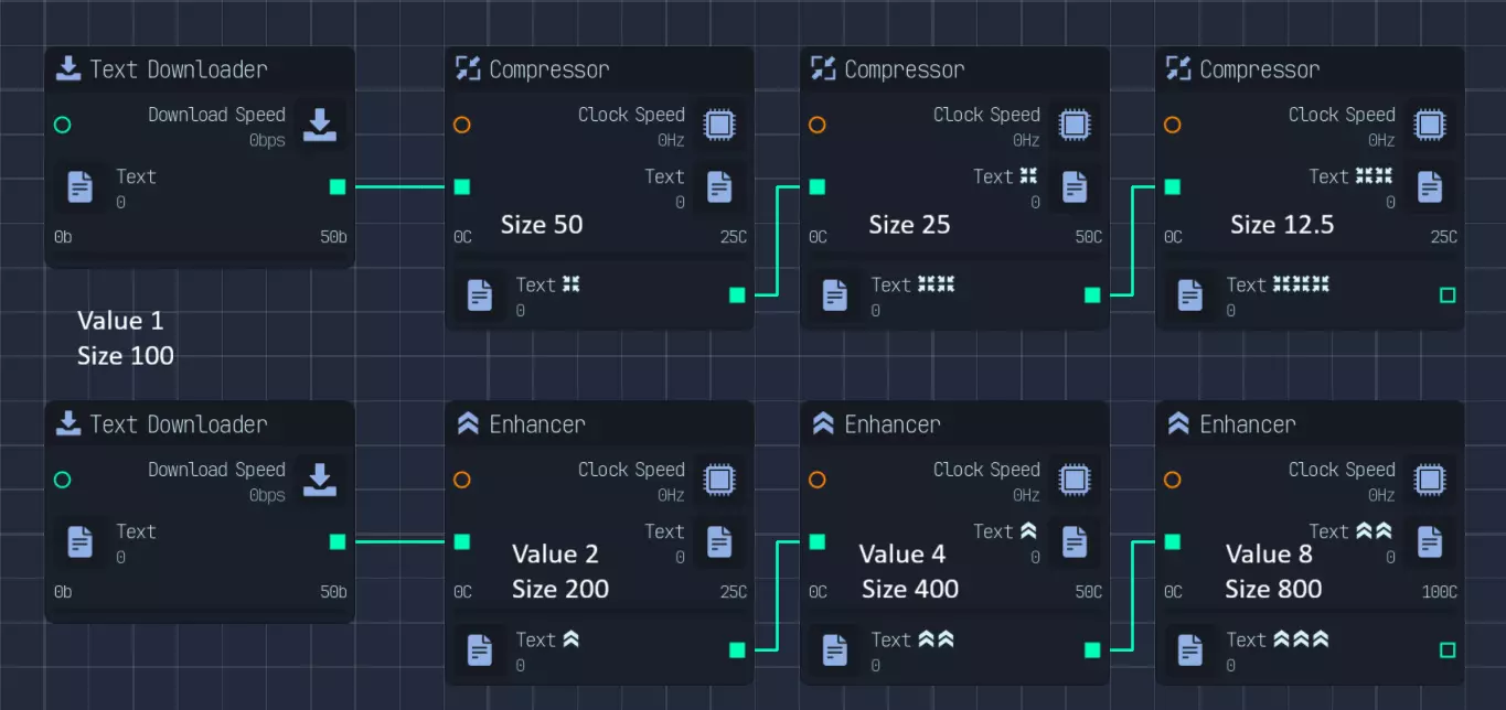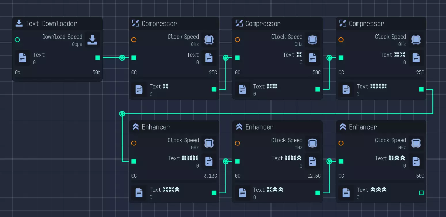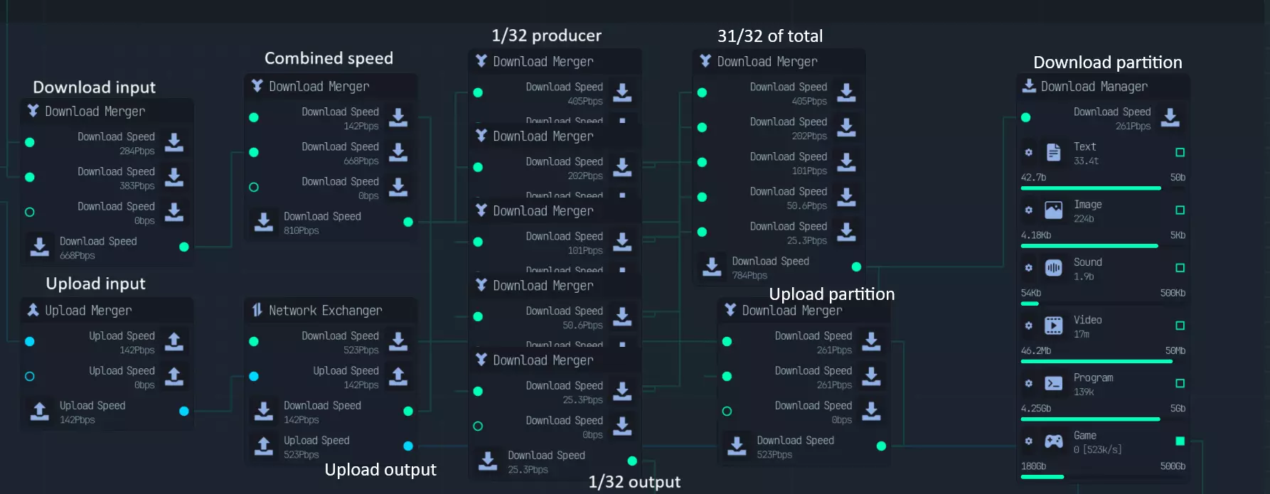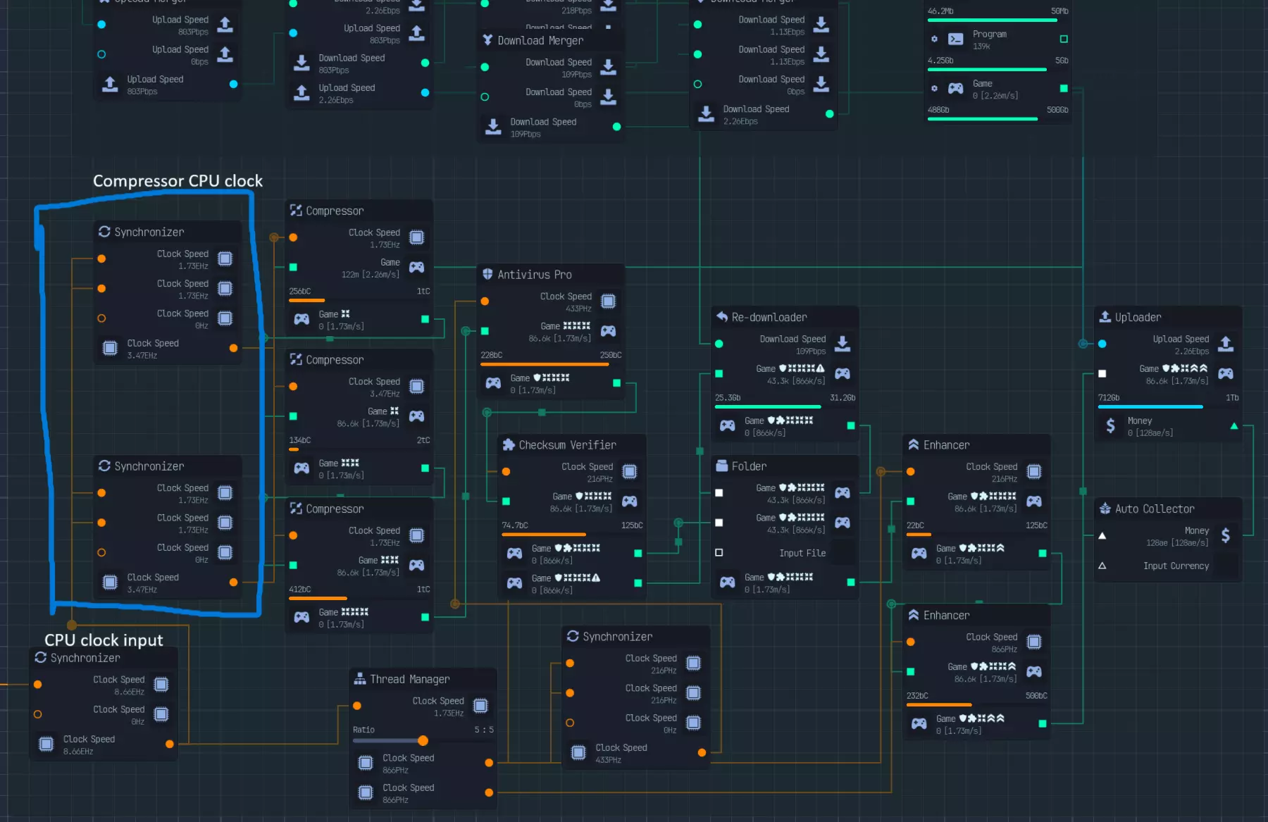 修改链只是其中一部分。为了充分利用网络速度和CPU时钟这些有限资源,我们需要对它们进行合理分配。 关于如何优化的说明将在后面的章节中给出。 网络使用情况如下: - 下载大小为1的文件 - 将文件压缩至原大小的1/8 - 有50%的概率需要重新下载文件,且重新下载的成本仅为文件大小的50% - 因此平均下载速度为1/32 - 将文件增强至大小2 - 上传大小为2的文件 总体而言,网络资源需要按照重新下载、文件下载和文件上传1:32:64(总计97份)的比例进行分配。不过,要将原始流分割成97份是比较麻烦的。因此,我会将网络以1:62:31的比例进行稍欠优化的分配,方法是先创建1/32的部分,然后将剩余部分按2:1的比例分配。 为实现这一点,我们首先通过网络转换器将所有网络速度转换为下载速度(我选择下载),并通过下载合并器进行合并。 然后,我们将网络流分割5次以获得1/32的部分,同时将另一半放入另一个网络合并器。从这个合并器中,我们分出2个流用于上传(并转换为上传速度),1个流用于文件下载。