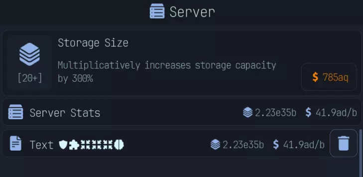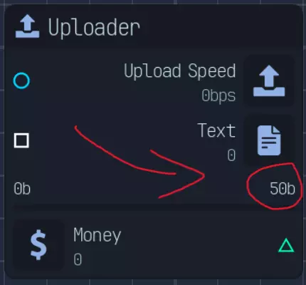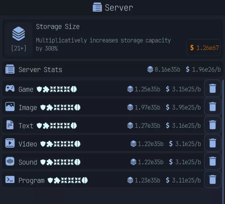 到了游戏后期,你会解锁服务器。服务器会根据存储的文件数量和提供的上传速度来生成金钱。如图所示,存储的文件就是存储值,其单位为每字节上传速度对应的金钱数。