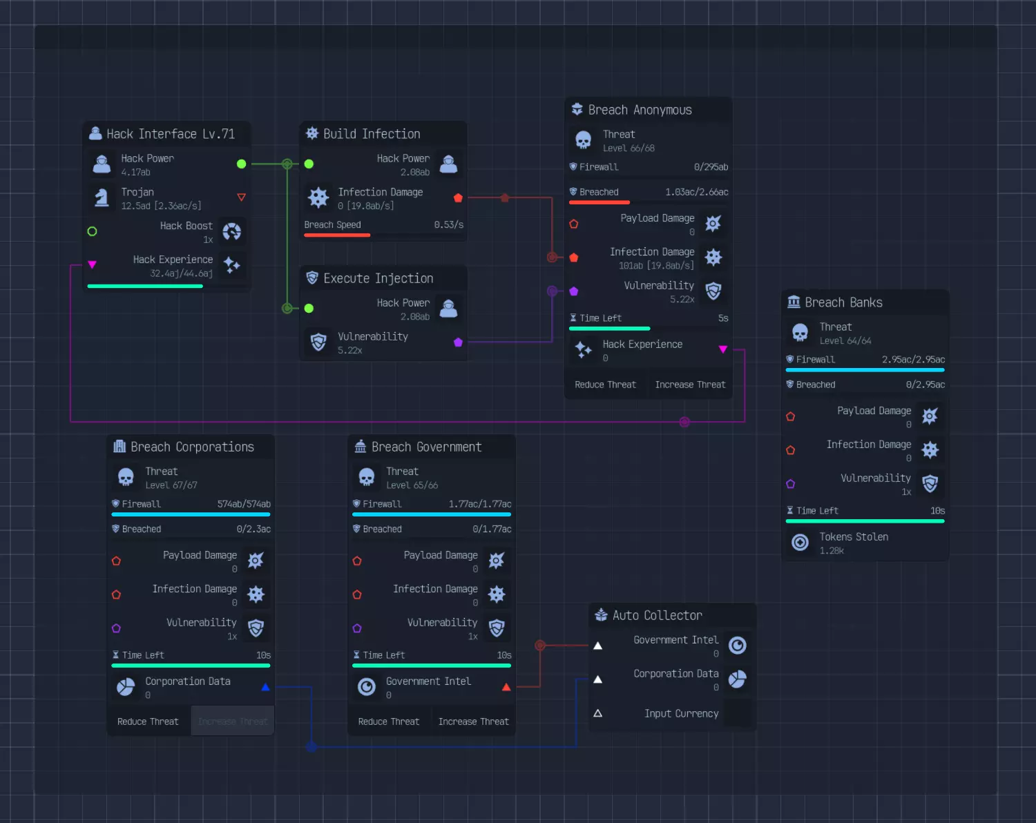 应下载什么文件类型 你要始终向数据实验室传输比其消耗更多的文件。即使你稍微超出了它们的消耗,也很少需要升级提供给实验室的文件类型。这是因为下一种文件类型的大小是原来的100倍,需要100倍的下载速度和CPU时钟频率,却只能带来两倍的研究点数。 大多数时候,你会下载图像文件,因为它们是最经济的选择。 黑客布局 我尚未研究出最优的黑客布局。在我的整个游戏过程中,我对感染类型的伤害感到满意,后来又添加了执行注入。