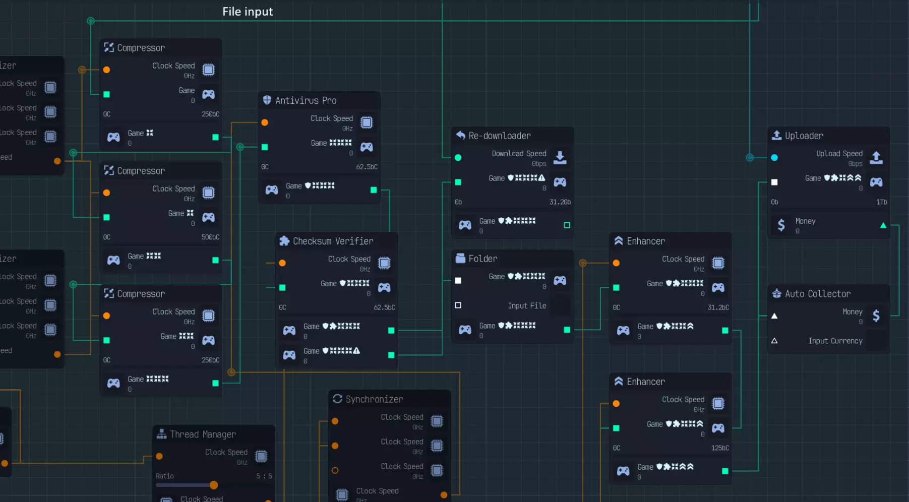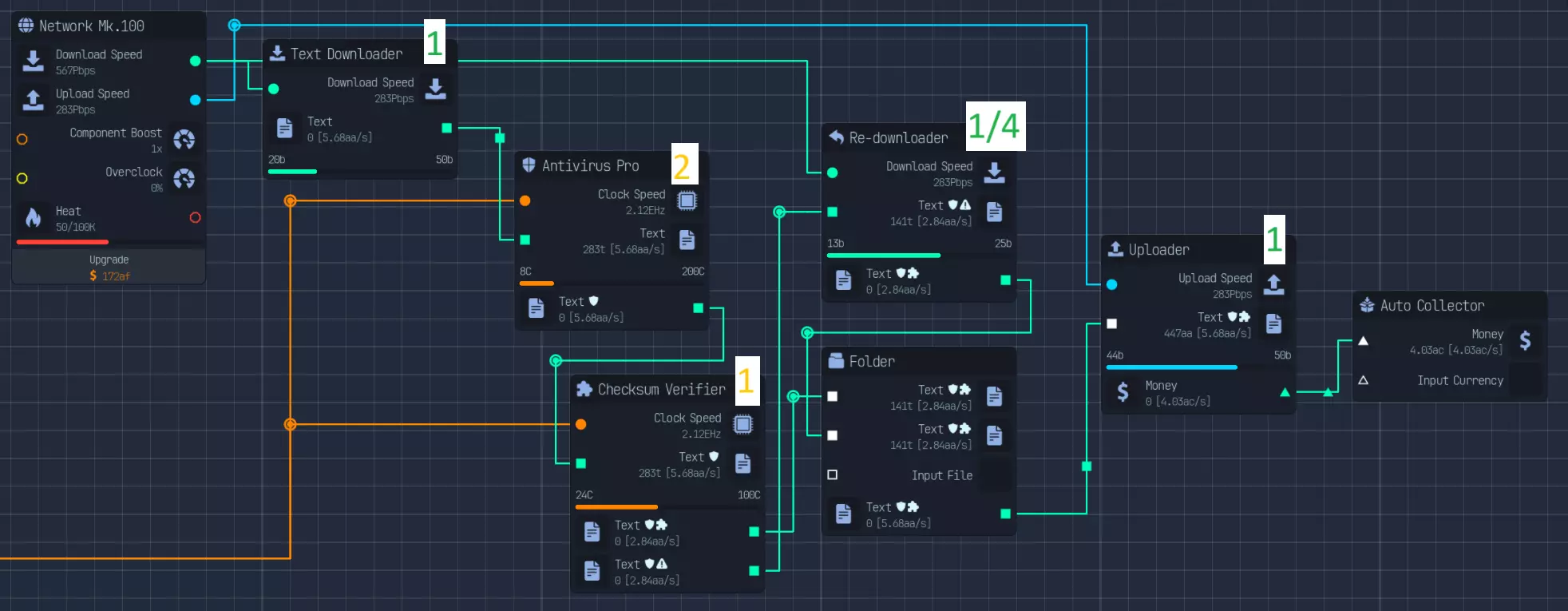 前期游戏 在游戏前期,你需要下载文件、处理文件然后上传文件。 我假设所需节点已解锁。如果没有,在解锁前可以暂时忽略它们。 如果你无法连续压缩3次,那么就尽可能多地压缩,并只强化一次。 修改流程如下: 下载文件 压缩3次(或尽可能多次) 杀毒 校验和验证 损坏(50%概率):重新下载并移入文件夹 验证通过:移入文件夹,强化2次(如果压缩次数少于3次,则只强化1次) 上传 收钱