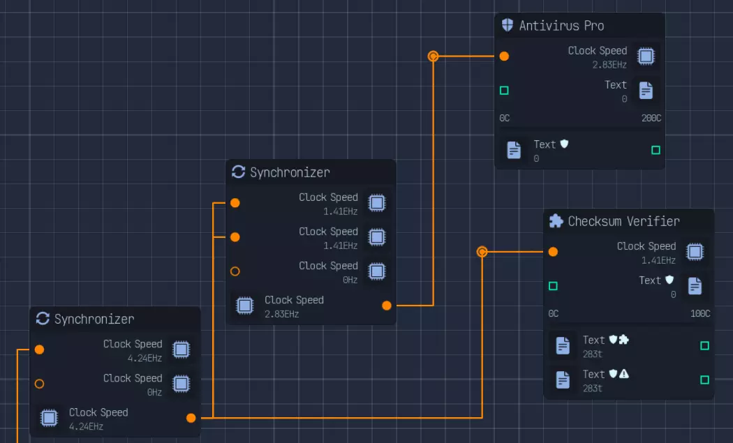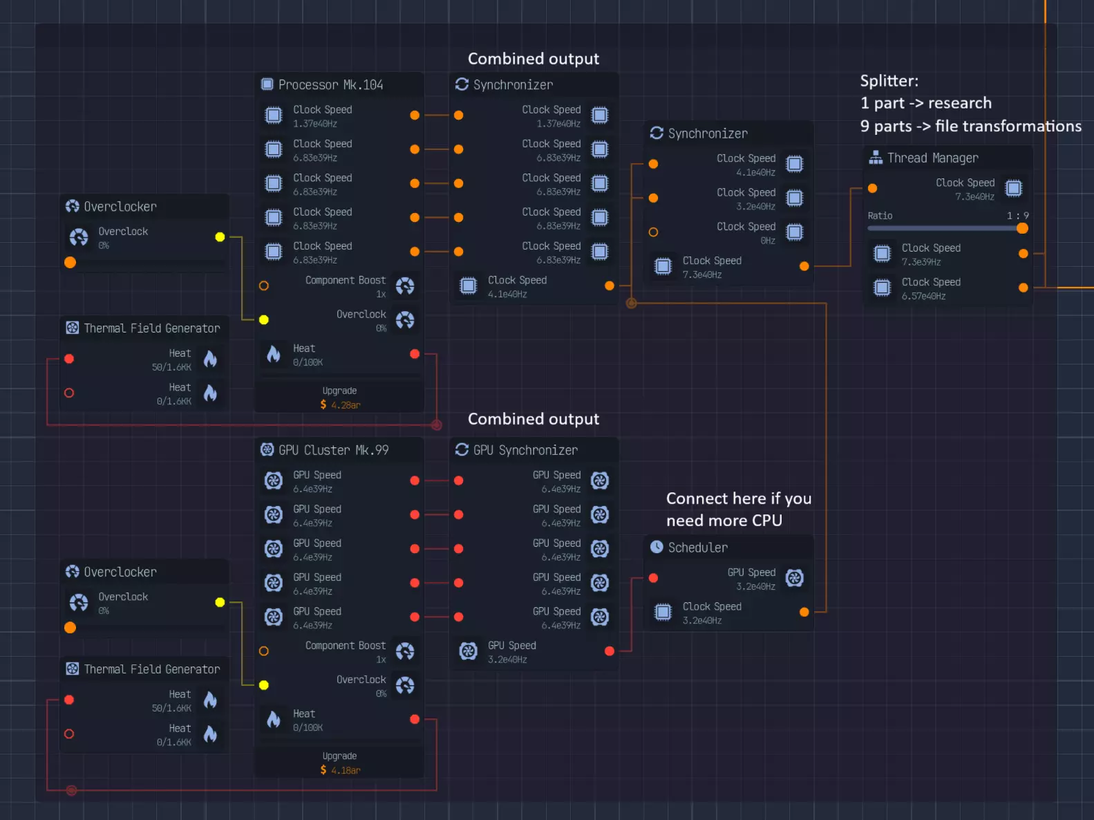 相对文件大小 相对货币产出 货币与文件大小比率 3 7 2.33 6 9 1.5 12 14 1.16 我们注意到,随着文件大小的增加,单位文件大小增加所带来的货币产出增量会减少。我假设这是一种对数关系。 获取最大货币的最佳方法:最佳方法是将服务器装满所有类型的文件,并以均等的方式进行完全压缩。 CPU和GPU布局:为确保充分利用所有可用资源,需将处理器和GPU的输出合并为单个流。然后建议将输出分流,其中1部分用于研究,其余部分用于更密集的文件转换。如果你尚未解锁人工智能,可使用同步器将图形处理器转换为中央处理器时钟速度。
