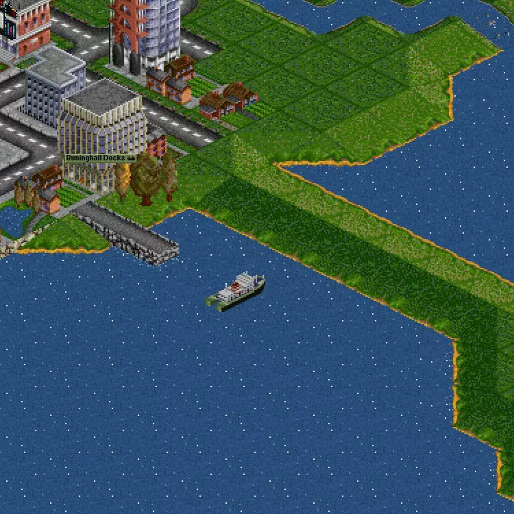 船只 SimpleAI脚本不会使用船只(原版游戏中的AI也不会),但为了内容的完整性,我觉得有必要加入这一章节。在我看来,船只总像是后期才考虑加入的元素,因为它们的设计不够完善,可用选择也非常有限。油轮的速度极慢,但能运输大量石油——基于这一点,有些玩家可能会利用油轮在炼油厂生产货物,再通过高速火车将货物运往遥远的城市,从而获取巨额利润。出于某种原因,船只不会发生事故——它们永远不会相互碰撞,即使占据同一空间(我猜这与寻路机制和缺乏明确航线有关),而且即使所有仓库和车站都被移除,船只也不会像飞机那样因燃料耗尽而失事。 由于无法摧毁竞争对手的船只,你能采取的最佳策略就是阻碍它们,阻止它们到达目的地——这意味着你需要进行大量昂贵的地形改造。在景观美化菜单中使用抬高工具,可以创建完全阻挡河流和河口的地块——但每格地块的成本约为1万至1.5万英镑,因此在开阔水域或大型湖泊中阻挡码头通道的成本可能过高,甚至会抵消你获得的任何经济优势。由于大规模景观改造,你还会受到地方当局的声誉惩罚,这可能超过竞争对手因未从车站转运货物而受到的惩罚(不过你可以通过大量植树来重新获得他们的好感)。 那个码头看起来真不错……