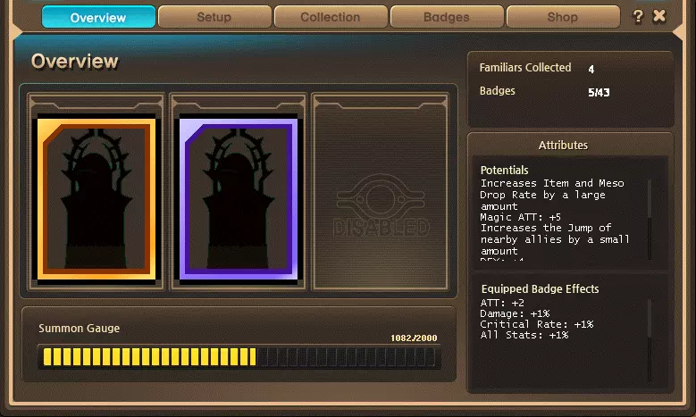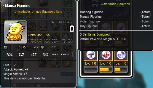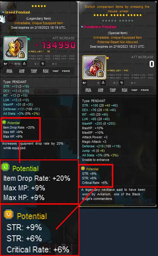 NOTE; THAT THE HEART WILL ONLY WORK WHEN YOU HAVE THE SAME OR HIGHER RANK ANDROID. MEANING A RANK 5 HEART WILL NOT WORK WITH A RANK 4 ANDROID. ONLY A RANK 5 OR HIGHER ANDROID CAN BE COMPATIBLE. IF YOU HAVE AN INCOMPATIBLE HEART AND ANDROID YOU WILL NOT RECEIVE THE STATS OF THE HEART. Advanced gear progression Arcane UmbraOnce you have reached lv. 260, you can start grinding for your Arcane gear. You will now want to run Lucid/Will(LuWill for short) parties. Just like AbsoLab you will need to kill Lucid & Will to get the Boss "tokens". Except this time Droplets are farmed a different way instead of weeklies. There are no weeklies for Droplets, therefore Droplets are much harder to get. You can get Droplets by defeating Lucid/Will or by killing MOBS after Lachline region. You can also buy them from other players in the AH. In Reboot can buy these at merchants after Lachline region, coming in at 50 mill a Droplet or alternatively from Event Shops. Alternatively you can hope for some Arcane Boxes drops from HLuWill. These are hard to come by so if it is your main I would recommend buying your first gear off the NPC shop. And use these as backups for when you want to push past 17*. MORE TBAdawn set pitched ethernals GolluxHellux is the hardest difficulty which you can do to get superior Gollux items. The only 2 obtainable droppable items are the Belt and the Earrings. How do you get the Ring and the Pendant? The Superior Ring and Pendant are able to be bought at for 700 Gollux coins each. Both the reinforced and the superior rings are BiS(in REBOOT, not so much in regular sever). Try to hold off on buying the Belt and the Earrings as they have a chance to drop. These drops are low chance so it might be difficult to get. Your priority should be on buying the Ring and the Pendants since they have NO chance of dropping. If you have enough coins let after that(1400 coins for both Ring and Pendant) then you can get the Earring/Belt. But even then I would rather buy Reinforced Ring and Pendant. The Belt alone has a base MATT + ATT of +35. Which is absolutely insane. The reason as to why I say Reinforced pendant as well is because: you get the additional +2 set effect but not only that you can never have enough rings/pendants/accessories/earrings. Why? You'll find out in the next headline. Mesos obtainedMesos gear allows you to obtain more mesos while you grind. So it's a win/win. If you would grind regardless why not make some mesos while you're at it. Why is "mesos gear" so important? After reaching late to end game you will want to min max your gear. But to do that it'll cost you a pretty penny. This is where mesos gear comes in. How to get "meso gear"? Through potentials. "Mesos obtained +20%" is a legendary potential line. Meaning you can only get it in the "legendary" tier. The same goes for "Item drop rate +20%". +20% is the only % you can get for both of them. So no more, no less. But you can get 2 lines of those 20% on one equipment. As they do stack with each other, regardless on what equipment it is. Which gear can obtain "mesos obtained +20%" potential? Rings Pendants Face accessories Eye accessories EarringsLet's say for example that you have 1 line of mesos obtained on each equipment. That'll be +100% mesos obtained. What else can give mesos obtained aside from gear? Besides equipment there is: Legion's Wealth coupons Wealth Acquisition Potion(WAP for short) Inner Ability(IA for short) Phantom legion card Monster Life(for reg server) (REBOOT get free 500% base mesos obtained)Legion's Wealth coupons gives +50% WAP gives you 20% IA gives you up to +20% Additionally Shadower's have a passive that nets them another +20%. These are all stackable. Legion is additive, wealth is multiplicative. Lastly I would HIGHLY recommend to cube EVENT RINGS for mesos obtained. As these rings fully built up have +40 all stats and +25 MATT/ATT. The reason why I say this is because to reach +40 all stat on a starforce-able ring you will need to have at least 15 stars on it. Which will cost a lot of mesos. And to add because it has "mesos obtained +20%" line on it, it takes up a spot of main stat % line. Meaning you will lose out on some damage. Drop rateWhy is "drop gear" so important? After reaching late game you will fight the harder weekly bosses(From Lucid up to Seren, including Hard Lomien). These weekly bosses drop their boss set. Which is much better than the old boss set. This new boss set is called pitched. But these are extremely hard to get due to the chance of them dropping is incredibly low. This is where drop gear comes in. How to get "drop gear"? Through potentials. "Item drop rate +20%" is a legendary potential line. Meaning you can only get it in the "legendary" tier. The same goes for "Mesos obtained +20%". +20% is the only % you can get for both of them. So no more, no less. But you can get 2 lines of those 20% on one equipment. As they do stack with each other, regardless on what equipment it is. Which gear can obtain "Item drop rate +20%" potential? Rings Pendants Face accessories Eye accessories EarringsLet's say for example that you have 1 line of item drop rate on each equipment. That'll be +100% item drop rate. What else can give item drop rate aside from gear? Besides equipment there is: Legion's Luck coupons Wealth Acquisition Potion(WAP for short) Inner Ability(IA for short) Legion Artifact (REBOOT get free 500% base mesos obtained)Legion's Wealth coupons gives +50% WAP gives you 20% IA gives you up to +20% Drop rate can usually be put on fodder equipment that you don't use. The reason why is because most(not all) bosses now have chests that you need to break before getting the loot. That means you can take your time and switch to drop gear. This saves you from having to fight with the drop gear equipped. Making you lose some stats. Written Guide[docs.google.com] Credits: Uncapped Games Star Force & Spell Tracer Star ForcingGeneral rule of thumb, you usually do not want to Star Fo