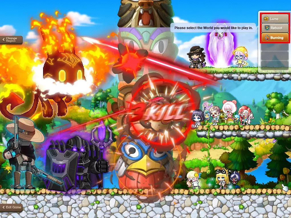 Now which region should you choose and why?The biggest difference in these two regions is the amount of players. This can either be a pro or a con, depending on your preference. NA being more populated than EU. Sidenote; I've been playing NA even though I'm EU. Because of the fact that I have people on NA to play with, I can't speak on EU since I don't really have played on it(as of lately). I am sure EU is lots of fun too. (The latency on NA isn't that bad for me. Especially using ExitLag. (not a sponser)) Moving on to the worldsDepending on which region you chose the outcome of the worlds will be different. Let's start with EU since it only has 2 regions. But before we start about worlds within each region you need to know the difference between a regular server and a "Reboot" server. What is a Reboot server? And how is it different from a regular server?A "Reboot" server is a server where "p2w(pay2win)" features are removed. What does that mean? It means that everything you can buy with real life money to progress faster in the game is removed. Instead of that they made it to where you can buy those things with ingame money instead of real life money. But the trade off is, that you can't trade with other people. No pun intended. Reboot also has additional exp and meso drop rates. Meaning you will level up faster and gain more money ingame. This is a given because everything in this world cost ingame money. So you'll be needing lots of it. At first this sound good on paper/sounds easier. But in reality this is and will be harder when you are a new player. The reason is that because you can't trade you can't progress further if you're stuck. No new gear, no better potions etc. One of the other changes in this server is that you can have more than one profession. Unlike regular worlds, where you can only have one. I will go further into details about what a profession is later in this guide. You now also have a second option when it comes to Reboot: Hyperion. The exact same as Kronos just a fresh start, meaning less players. This is both a pro and a con, refer to the statement on the EU server having less population. Note; that cosmetic items are still purchased through real life money. Keep that in mind. Sidenote; there are a lot of botters(hackers) in this world. Making it sometimes impossible to play(because of no training spots). But this only applies to higher level areas. You won't have to worry about it until very late. I do not know too much of this and neither do I know what Nexon has done to prevent this. Keep that in mind if you if you really want to play in this server. I'd suggest doing a more research for this world. So why EU? And what does EU have to offer?EU has two worlds to offer. One being the Reboot we just talked about and the other being a regular server called; "Luna". This is the only regular server, unlike NA who has more than 1 regular server. EU used to have more worlds but they all merged into one, due to the fact that the worlds were underpopulated, making Luna the only world left. With this in mind, EU is a less populated region making it more calmer than NA. If you want a more calmer experience I'd recommend EU. The reason why this is a pro is because if you want to train in a spot it's less likely to be taken by another person. A con, depending on your perspective, is that there are less people to interact with. So why NA? And what does NA have to offer?So unlike EU, NA has more regular worlds to choose from. And same as EU, it has Reboot in it. And this being more populated than EU means that this Reboot server will have more botters((hackers)but again, I do not know of this too much. So do your own research). You have more variety to choose from. NA has less populated worlds and also populated worlds. A bit of both, as it should be. Balanced. Out of all these worlds Bera is the most populated. Most streamers either play in Reboot or Bera. So if you want to play with streamers I'd recommend playing in one of those worlds(again I wouldn't recommend Reboot, unless you know what you are doing). But if you don't there are plent of worlds to choose from. But keep in mind that the more players in a server, means less training spots will be available but more gear you can buy from other players. So it's a pro and a con. This goes the other way for less populated worlds, more trainingspots less gear to trade. And depending on which world you choose the economy will be different too. If there are more people, more people will sell the same stuff, making those items less valued. The other way around in less populated worlds. Less people means less items and that means higher prices. No clue where to start?/Need a recommendation?/Need someone to play with?I use to play in Bera, now I play on NA Kronos. If you need anyone to play with I'm more than happy to play with you, although I don't play on regular server anymore. My recommendation depends on what you like. But I would for sure recommend NA as a region. Due to the fact that you have more options. Even if you are from EU, the latency isn't that bad(for me). Aside from the region I would recommend NA Bera/Hyperion, but do go to a less populated server if you don't want to play with a lot of people. With that in mind I would recommend either Aurora or Elysium. Aurora being my first choice. FAQ #1 So now that you have chosen a region and a world, what now? Now you can choose a class to play the game with. Before choosing a classThere are two events that help you level your character extremely fast. These events are called burning events. Make sure you make use of these events as it's extremely easy to level. What is the Burning event?Burning events let's you level 3 times instead of 1 for each normal level. Meaning if you would level up from lv. 10 > lv. 11, instead you level 3 times; so from level 10 > 11 > 13. How do you access a burning event? Well that depends on when the event is running. Only when this event