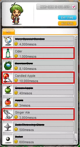昭和镇有一些有用的东西。首先是一个商人,他出售: 苹果酒(武器攻击力+20,持续5分钟) 糖苹果(全属性+7,持续30分钟) 姜汁汽水(恢复75%的魔法值和生命值)