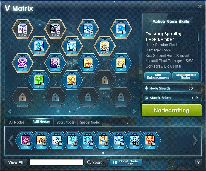 第五职业与节点 当你达到200级时,可以开始第五职业的转职。完成第五职业转职后,你将解锁名为V矩阵的第五职业技能标签页。通过这个新标签页,可以获得新的技能。其中一些技能仅适用于你的细分职业(例如:夜使者、主教等),而另一些技能则适用于特定的职业群(例如:战士、法师等)。要获取和升级这些技能,你需要节点石。这些节点石完全随机,打开时会获得随机的【节点】。你也可能获得重复的节点,但无需担心,因为你可以将这些节点合并以提升它们的等级。此外,还有【经验节点石】,可以为你想要升级的节点提供大量经验值。这些物品可以升级任何类型的节点。如果你不想要或不需要某些节点,也可以将其分解。分解节点会获得【节点碎片】。当你收集到70个节点碎片后,就可以选择一个特定的节点进行制作。