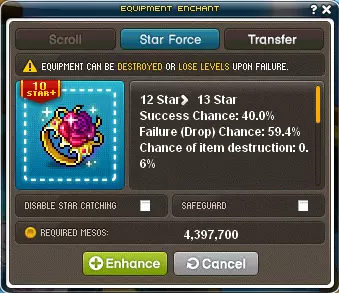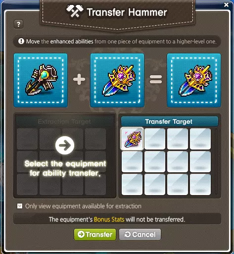 什么是转移锤?转移锤允许你将星星从一件装备转移到另一件装备上。例如,如果你强化失败导致装备“爆掉”,就可以使用转移锤。转移需要相同的装备,但你也可以用它将【强化等级和潜能(最高至稀有级)】转移到更好的装备上。转移要求如下:两件装备等级差距需在10级以内,且必须是同一类型装备/同一职业专用。这意味着如果你想转移所有星星,装备必须是战士职业对战士职业、双手剑对双手剑,且等级需为110级转120级、120级转130级、130级转140级等依次递增。