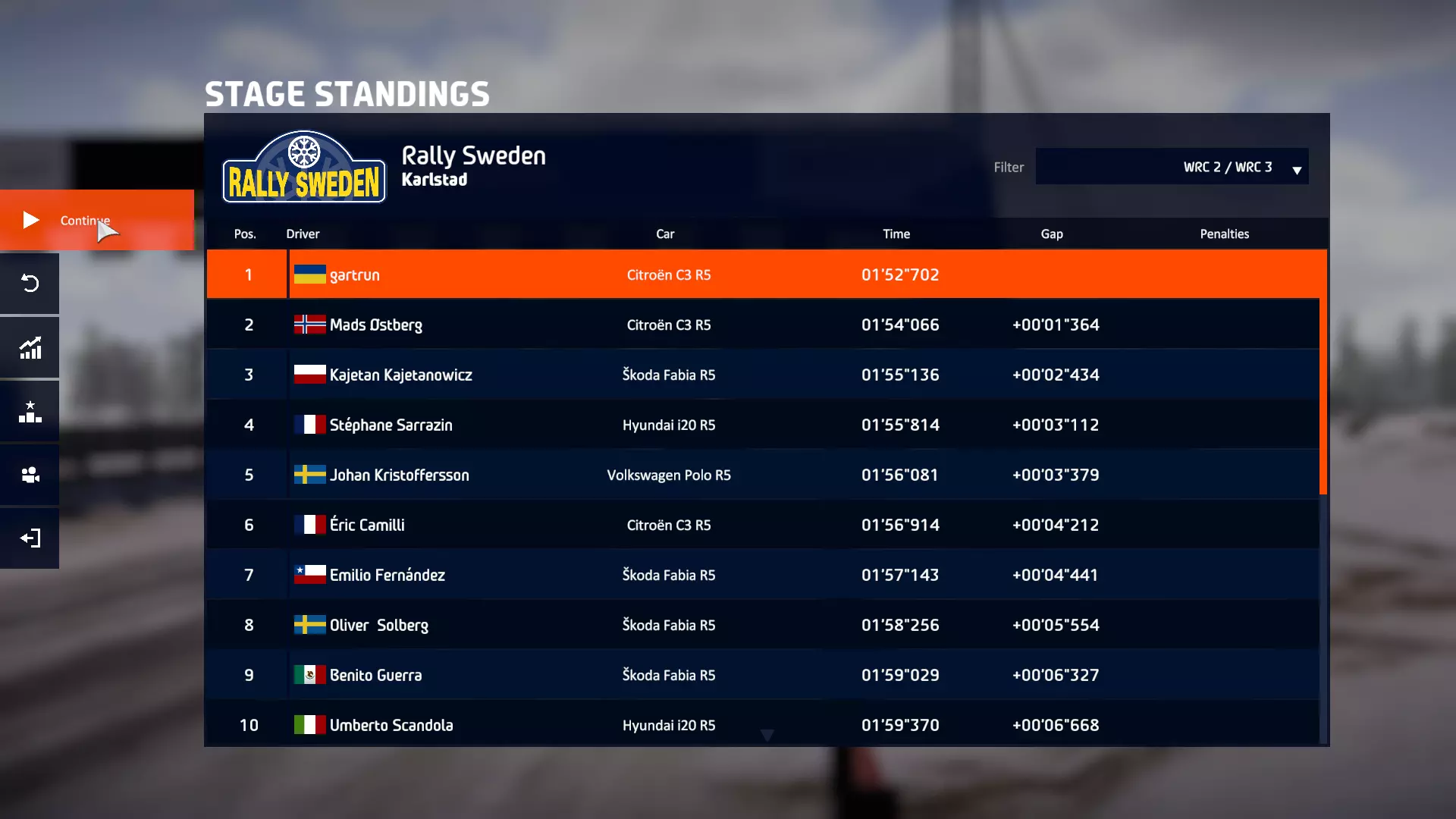 加入WRC 2锦标赛 通常,在完成你的J-WRC生涯后,你将开始WRC 2生涯 WRC Champion