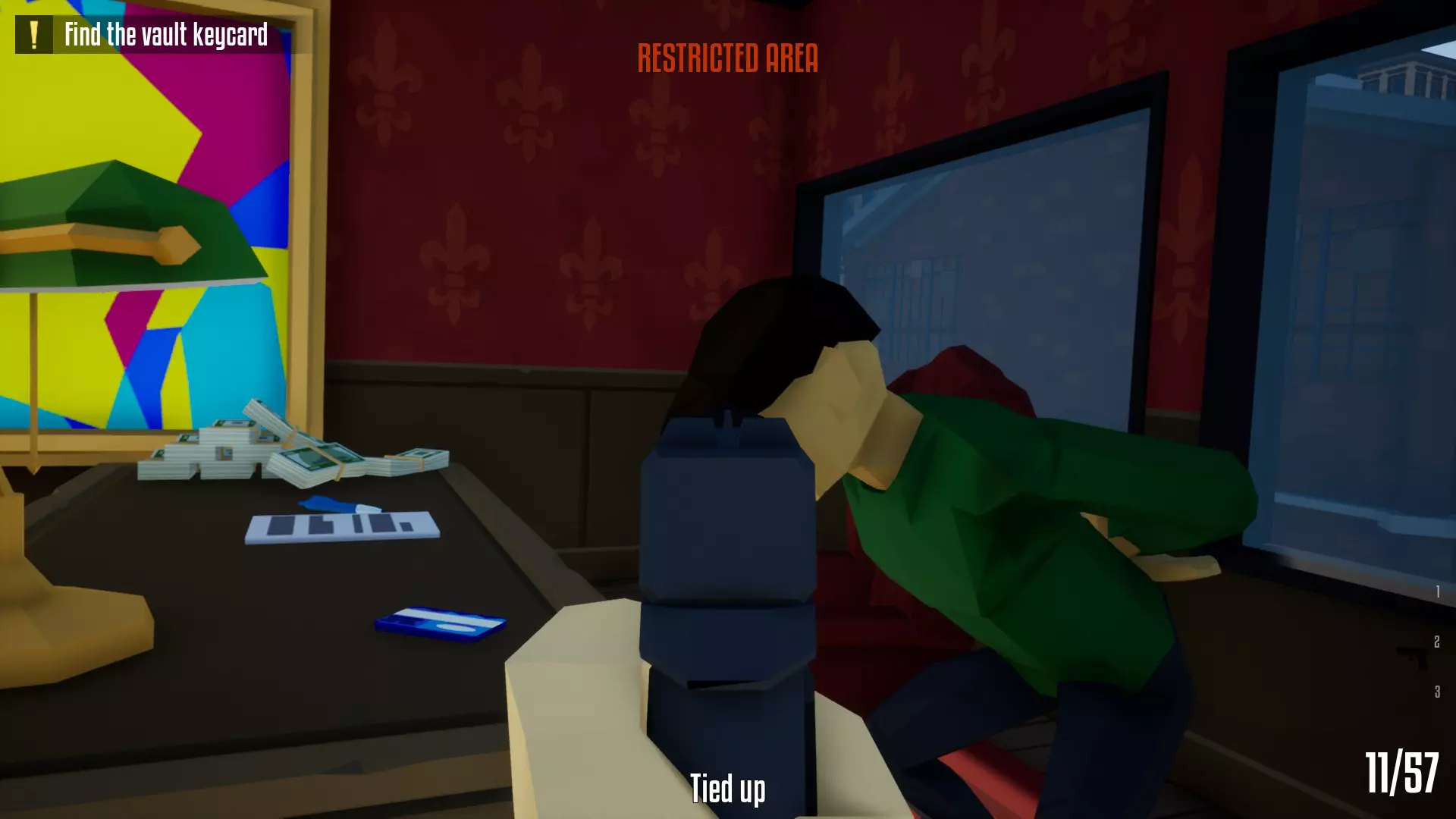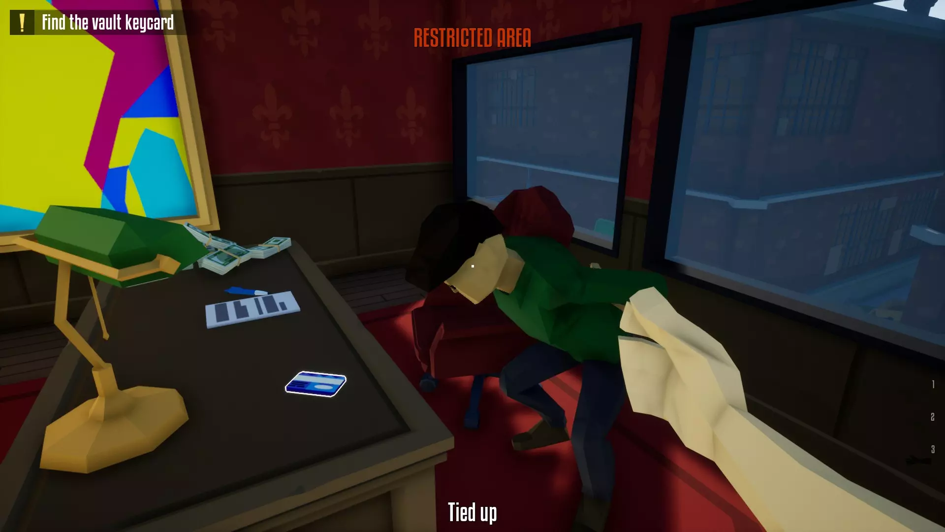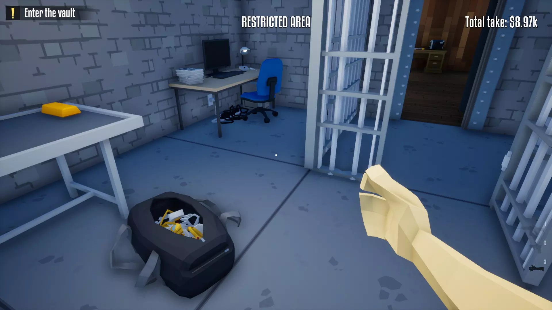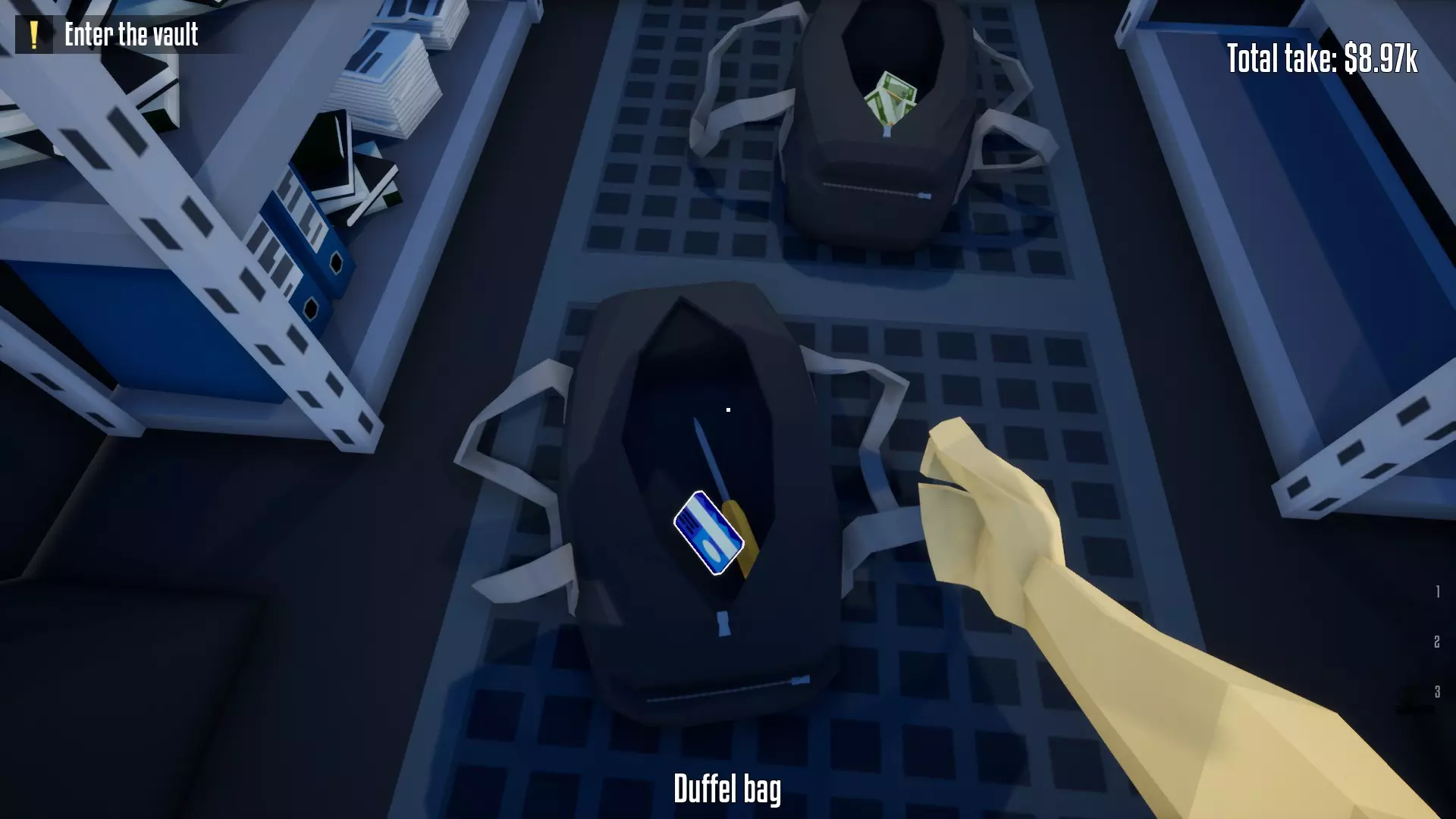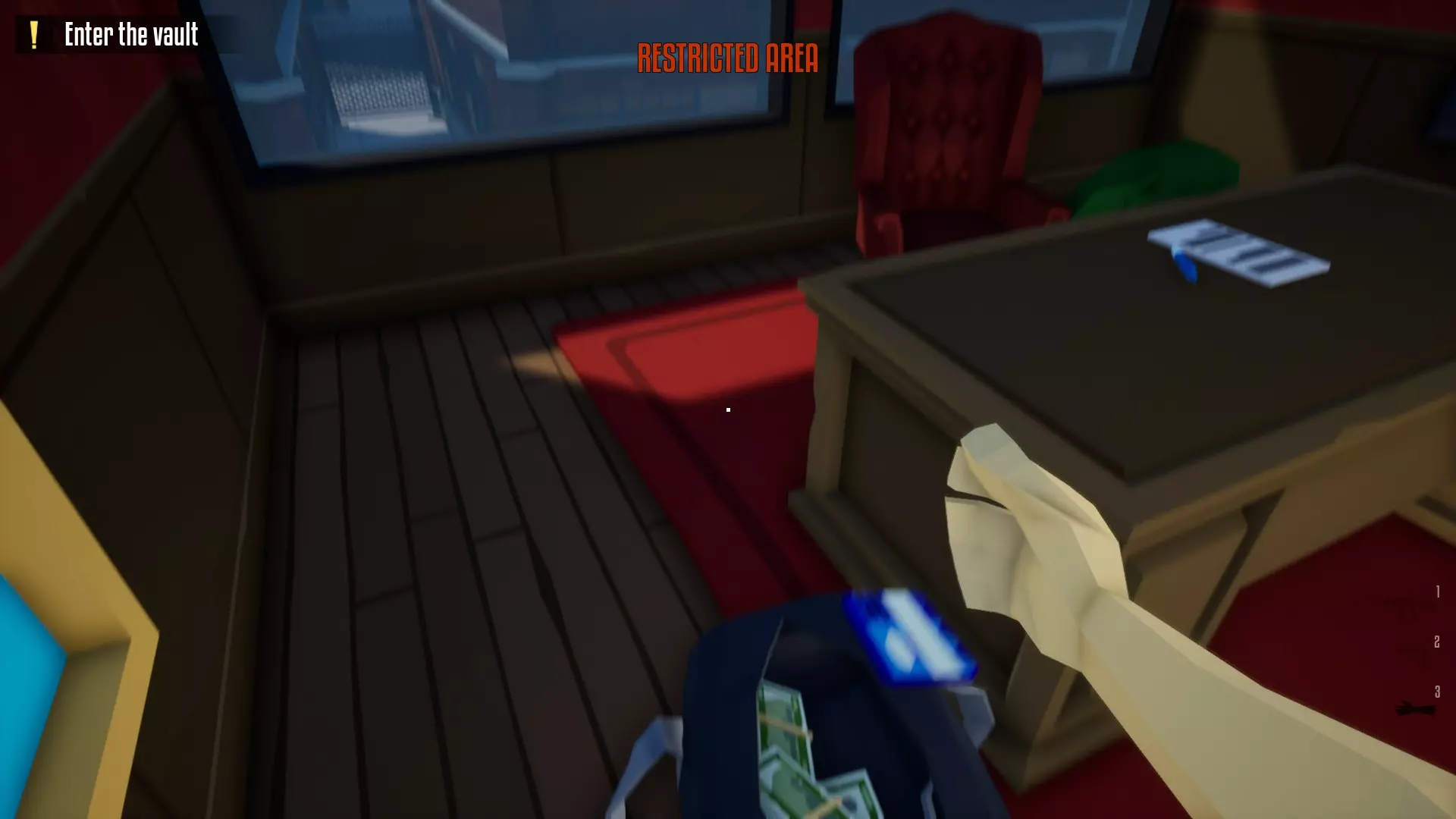 带上你的背包,去办公室搜刮钱财和保险库钥匙卡。