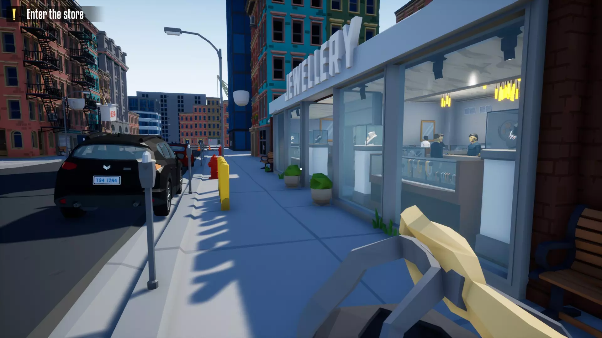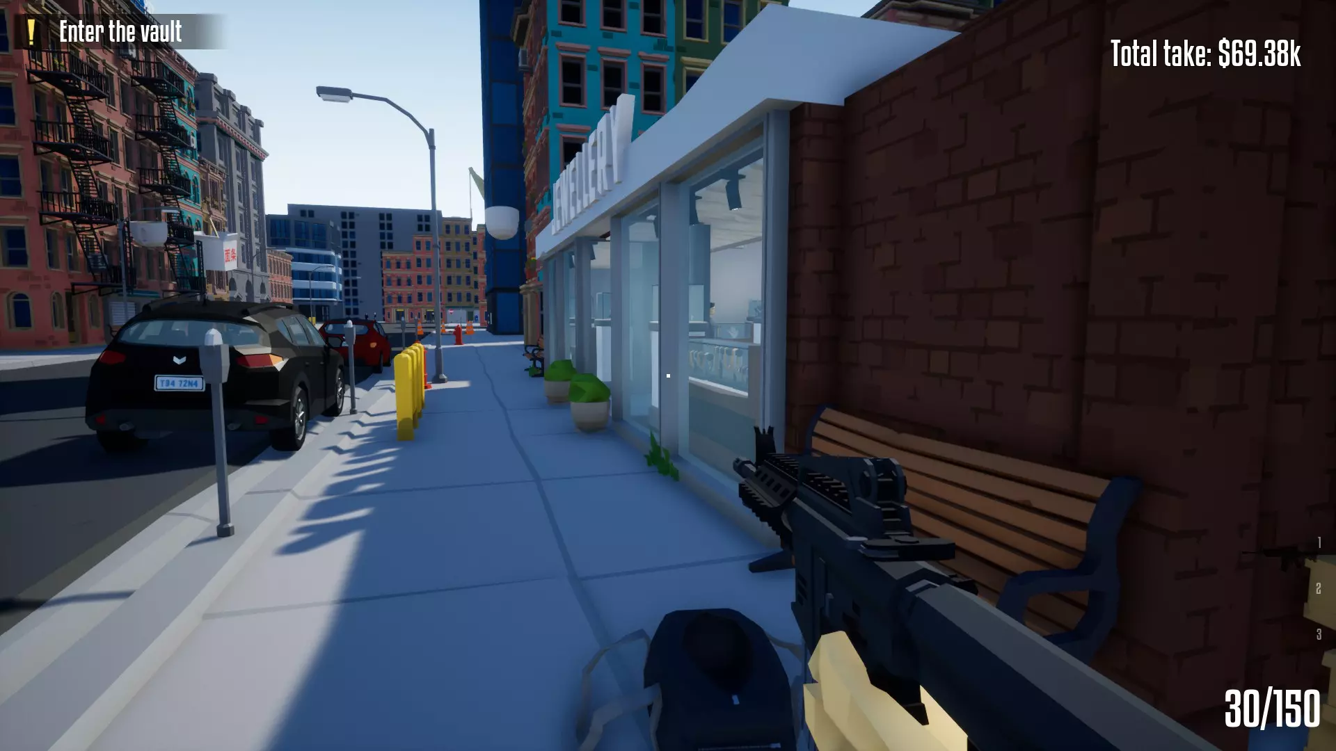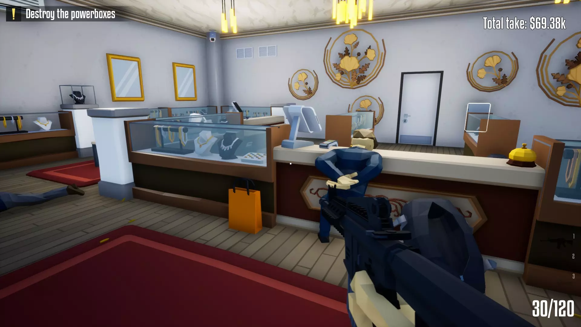 此时你已经可以带着70000现金逃脱,但前方还有一个额外的潜行转强攻的备选方案。 【可选】潜行转强攻备选逃脱方案 操作很简单:从货车里拿上最后一个空袋子,前往商店前门,将珠宝店洗劫一空后即可逃脱。