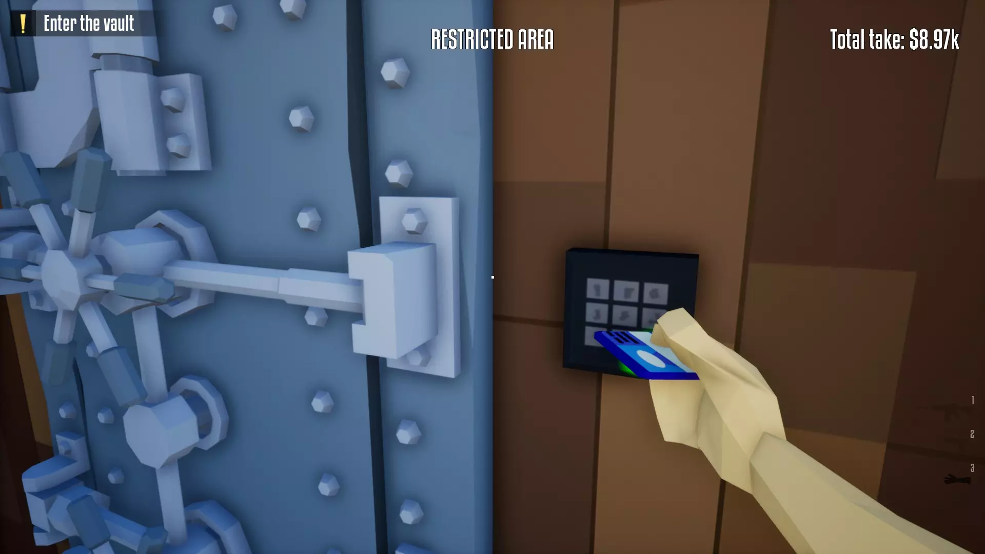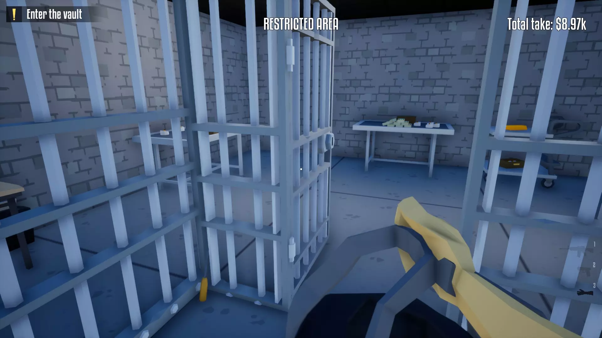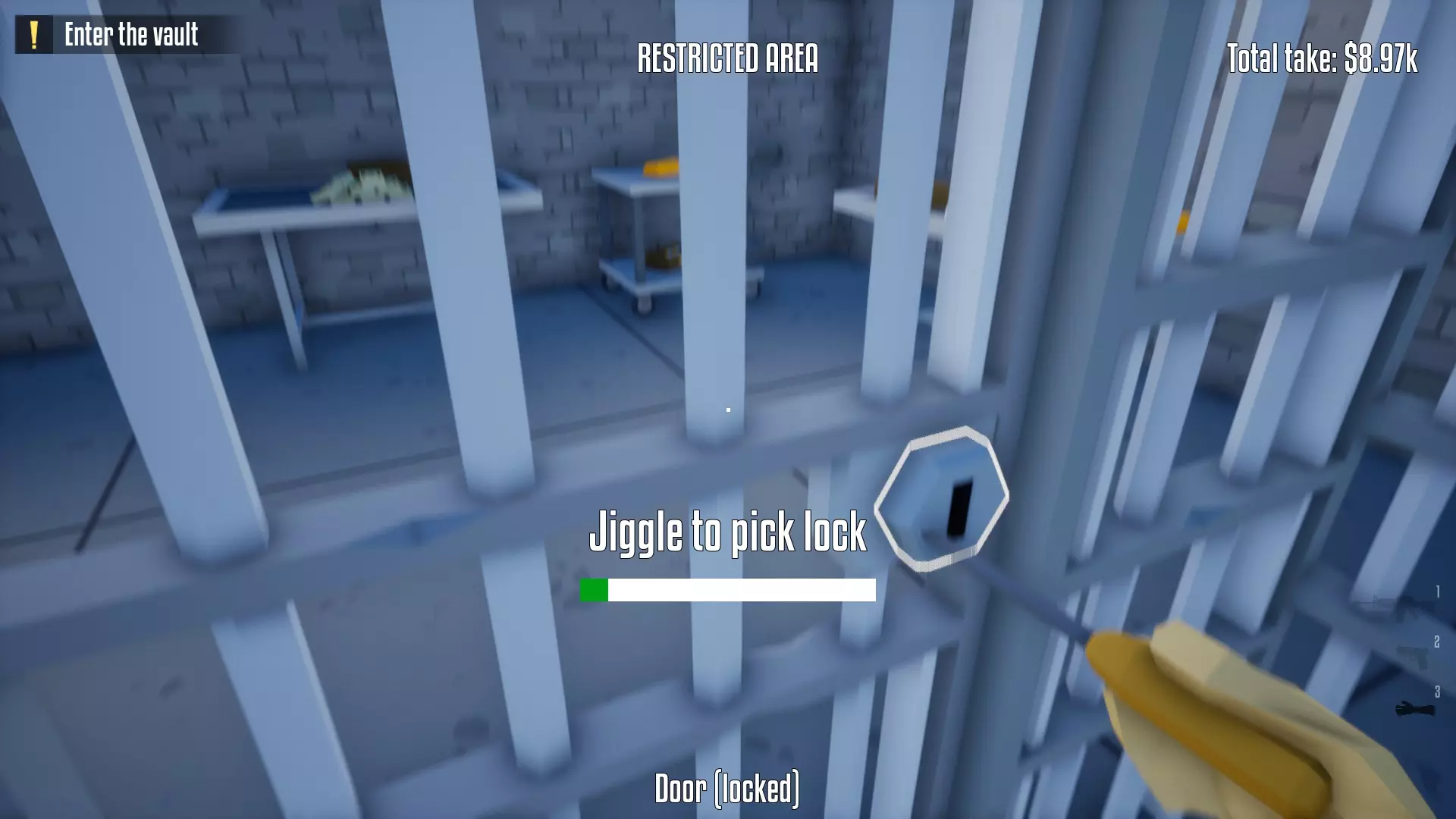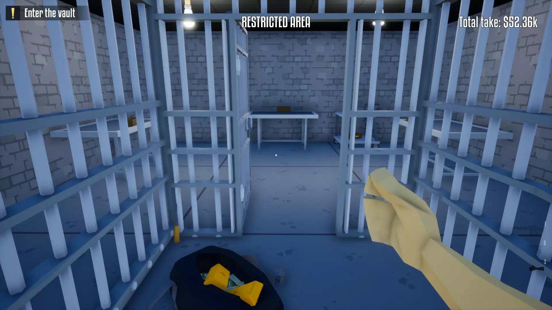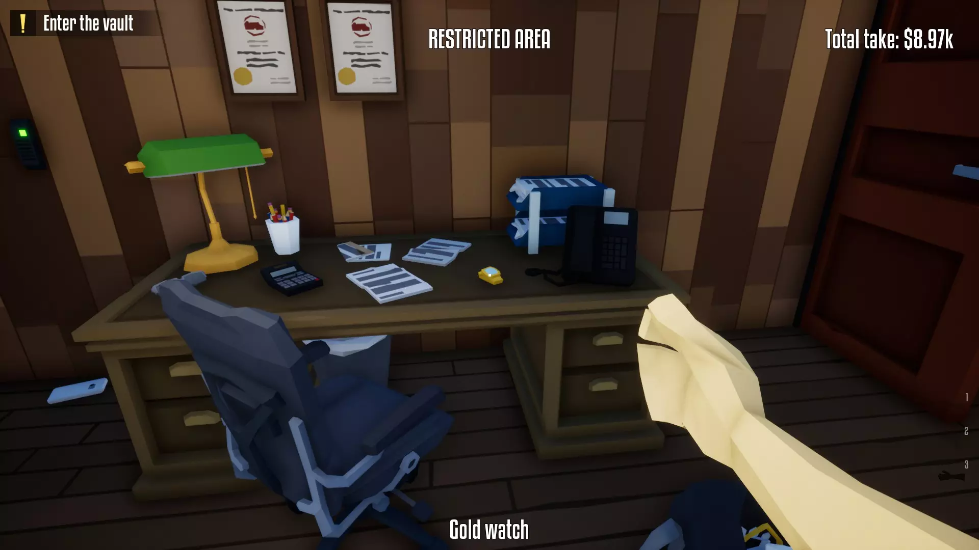 恭喜,保险库现已完全由你掌控!你可以随意撬锁开门并搜刮所有物品。不过,我建议你优先拿取项链、戒指和金表。