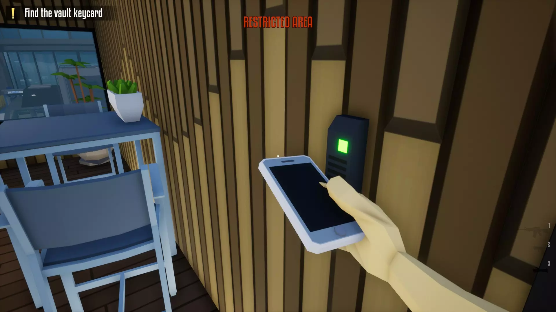 再次通过破窗进入建筑,手持保险库钥匙卡,从容地走向保险库的扫描仪。