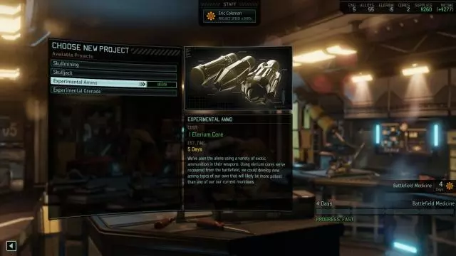 【试验场】-允许你建造/研发大量装备,例如特殊护甲、 grenades、弹药、设备/ gadgets 等。当然,这些物品需要时间和资源。至于时间,取决于项目和游戏难度(派驻工程师可减半)。至于资源,可以是各种东西:补给、合金/elerium、以及尸体。不过,该设施最重要的资源是一种名为【Elerium Cores】的新资源,因为几乎每个项目都需要一个。