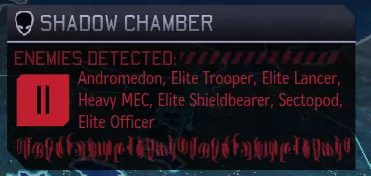 暗影密室的另一项功能是会显示任务中的敌人类型,让你可以调整小队配置来对抗即将面对的敌人。需要注意的是,如果你遇到了之前未曾遭遇过的外星种族,这里会显示【敌人未知】。另外,请注意数字(我的截图中是11),它表示该任务中你需要对抗的外星人总数(当然,不包括任何可能的增援)。不过,这个数字不会显示每种外星人的具体数量,仅显示总数。