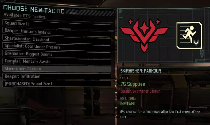 【游击战术学校】——允许你购买各种小队升级(类似《幽浮:未知敌人/内部敌人》中的军官训练学校)。它的另一项功能是可以指派一名新兵(一次一名)进行为期X天的训练(天数取决于难度,例如在老兵难度下为5天),使其成为你选择的职业的士兵!在训练期间,该士兵无法执行任务。一旦这个设施投入使用一段时间,你就不用再派新兵执行任务,祈祷他们存活、取得击杀并获得你想要/需要的职业了。这个设施有助于打造完美的士兵名册。