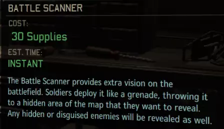 (每场任务可使用2次,地面持续4回合,无冷却时间) 【1】战斗扫描仪——有些人可能会觉得“这是游戏前期就能获得的基础道具,价格便宜,后期肯定会被其他道具比下去。我还是省那30补给不用它了,反正可能永远用不上。”这种想法是错误的!这个道具不仅能拯救你的小队,还能用来设下埋伏。把它扔到迷雾区域可以探测外星人,这样你就能决定“是本回合触发那个敌人小队,还是本回合重新部署,下回合再触发,或者如果操作得当,能不能引诱他们进入几个守望射击的范围?”该物品不仅能揭示一片区域,还能显形隐藏的外星人(例如伪装的无面者和钻地的蛹虫)。建议:尽早建造一个。没错,它们非常有用,但任务中会有很多物品争夺你的装备栏空间,所以你不会有位置带两个。