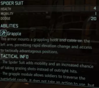 (对于不知道“闪避”是什么的玩家:闪避是使攻击变为“擦伤”并造成较低伤害的几率。) [1] 蜘蛛战衣——蜘蛛战衣。具备蜘蛛战衣应有的功能。它能通过抓钩荡来荡去吗?当然可以,左臂上就装有一个抓钩。说真的,这是一件非常出色的护甲,在游戏进程不算太靠后的阶段就能获得。拥有4点生命值、1点机动性和20点闪避,这件战衣能提供不错的早中期游戏防护。1点机动性听起来可能不算多,但有多少次你就差一格距离:就能到达掩护处?就能进入/脱离视线范围?就能让你的游侠进入近战范围对异星人挥砍?你应该明白这种情况。 抓钩:非常好用。它们是一种自由行动,可用于移动到屋顶、悬崖等地方。想象一下,拥有如此自由的移动能力,还能额外进行两次行动来调整位置或开火。唯一的缺点?它有冷却时间。这只是个小小的代价,但完全值得。 军需官提示:就像关于动力外骨骼装甲的部分提到的,你可能会忍不住大量建造这些装备,让你的小队都能像蜘蛛侠一样荡来荡去。但这并不值得! 首先,这会花费你大量的资源和时间,主要是在灵能核心上,而灵能核心非常珍贵,几乎所有试验场项目都需要用到它。你应该多样化你的试验场项目,把这些核心用在其他地方,比如研发 grenades、弹药、其他装甲等等。 其次,就像动力外骨骼装甲/战争机甲一样。战术服不会像捕食者装甲/典狱长装甲那样提供第二个物品栏位;而且你的小队需要留出一些空间来携带闪光弹/拟态信标/战斗扫描仪等防御性物品。 第三,还有幽灵战术服,它是该装备的更高级版本,所以你早期不要在这上面投入太多资源,因为之后会获得下一个型号。建议:建造一件(如果你等不及用幽灵战术服来获得第二个抓钩,也可以建造两件)。我最喜欢把它给狙击手,这样她就能轻松到达高处,从上方倾泻火力。第二个建议是给游侠,以获得更好的机动性,闪避能力也不错。