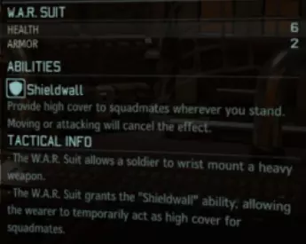 W.A.R.动力装甲——本质上是EXO动力装甲Mk II。它比前者多1点生命值和1点护甲值,并拥有特殊的【盾墙】能力,可让该士兵为另一名友军提供掩护。我个人尚未测试过【盾墙】能力,因此目前对此没有太多可说的[待后续测试后更新本节内容]。 装备小贴士:机动装甲 与重型装甲一样,机动装甲同样在试验场研发,且数量有限。