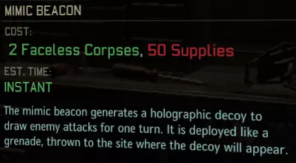 (一次性/任务) [6] 拟态信标——顶级道具。你是否遇到过士兵站位失误或被侧翼包抄,心想“糟了,回合结束他肯定活不成”的情况?别担心!这个小小的全息成像装置能在该回合吸引外星人的火力(直到它被摧毁)。为避免该装置过早损坏,建议将其放置在掩体后方。该道具在近期补丁中被削弱:1. 现在需要消耗75补给。2. 不再享受掩体加成,外星人攻击它必定命中。尽管如此,它仍然物有所值。 建议:有条件时制造一个。我会将其列为防御道具的优先建造项。