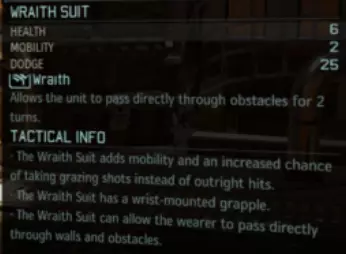【幽灵战衣】——本质上是【蜘蛛战衣Mk II】的升级版,拥有额外2点生命值、1点机动性和5点闪避,以及同样可靠的抓钩。它还具备一项额外特性:主动技能允许你穿墙(使用时为自由动作)。我可以花时间描述你能用它做什么,但还是留给你想象吧……用途实在太多了…… 推荐:让狙击手继续使用【蜘蛛战衣】(她不需要额外防御,因为她很可能“安全地”待在小队其他成员后方),把这件宝贝交给你的游侠。游侠通常位于小队前线(因此闪避很有帮助),额外的两点机动性对于侦查或配合剑斩穿墙的相位移动都非常有用。 研究提示