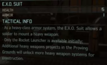 [1] E.X.O.动力装甲——这是你最早能获得的重型装甲。它拥有5点生命值和1点护甲值,相比掠夺者装甲(4点生命值,2个物品栏)具有显著的防御优势。“你是说我用1个物品栏换来了1点生命值和1点护甲值,这怎么能算大优势?”因为你还能获得一个重型武器栏位,这才是关键!还在为你的掷弹兵没有像《幽浮:未知敌人/内部敌人》中重装机兵那样的火箭筒而伤心吗?别再哭了,因为现在只要你愿意,任何职业都能装备一个! 如截图所示,最初你只能在这个装甲上安装火箭筒,但随着科技研发的推进,你可以在上面安装各种各样的其他武器,比如火焰喷射器或转轮机枪。你需要知道的极其重要的一点是:任何安装在此装置上的重武器在每次任务中只能使用一发弹药。 军需官提示:你们中有些人可能会忍不住花费时间和资源大量制造这些装置,心想“要是给半个小队都配上火箭筒该多好玩?”【不要这样做!】 首先,这会耗费你大量资源和时间,主要是【Elerium Cores(元素核心)】,这种资源非常珍贵,几乎所有“试验场”项目都需要用到它。你应该多样化试验场项目,把这些核心用在其他地方,比如研发 grenades(手榴弹)、弹药、其他护甲等。 其次,未来会有【W.A.R. Suit(战争机甲)】,它是该装置的更先进版本,所以前期不要在此装置上投入过多,因为之后你会获得更高级的型号。最后,穿戴外骨骼动力装甲(E.X.O. Suit)不会像掠夺者装甲或典狱长装甲那样提供第二个物品栏位,而你的小队需要留出一些空间来携带闪光弹、拟态信标、战斗扫描仪等防御性物品。建议:建造一个(如果你等不及战争装甲(W.A.R. Suit)来获得第二个重武器携带者,也可以建造两个)并装备给你的掷弹兵(最好在解锁齐射技能后)。