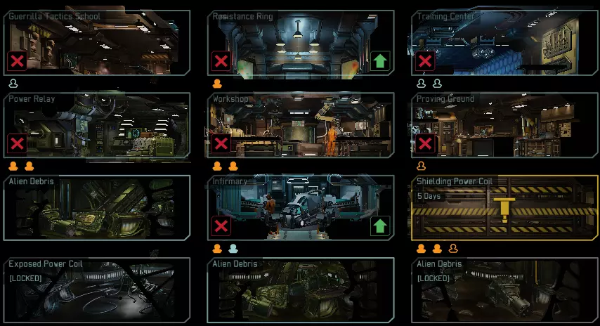 如你在图片中所见,新的复仇者移动基地现为3x4大小,共有12个房间可供你建造设施。 腾出空间:在国王(杰克)所罗门的矿井中作业 与《幽浮:未知敌人》/《幽浮:内部敌人》类似,你必须清理掉障碍物才能实际建造设施。但这次有个好消息!与《幽浮:未知敌人》/《幽浮:内部敌人》中需要付费清理地下基地的泥土不同,现在你可以从挖掘中收集补给品/合金了! 那么该如何操作呢?工程师,没错,他们是你的新朋友。尽早且经常招募他们。只需选择你想要清理的地点,指派一名工程师,然后瞧,你的新房间将在X天内准备就绪(取决于难度等级)。请注意,你只能清理与已清理房间相邻的房间,因此请做好相应规划。 共有3种不同类型的房间: [1] 外星残骸——清理速度最快,奖励少量补给。 [2] 外星机械——清理难度中等,但付出的努力越多,奖励就越丰厚。清理后可获得补给和合金。 [3] 暴露的能量线圈——清理难度最高,但这些地点很特殊。没错,当你“屏蔽”它们时会获得物资,但在这些特殊地点建造的任何设施都无需消耗电力即可运行!是的,这很棒,但如果你在其中一个地点建造电力中继器,该中继器会额外产生10点电力!从很多方面来说,这些就像是《幽浮:未知敌人/内部敌人》中的地热通风口,但有所改进——你可以选择放置一个电力中继器(这是最佳选择)或其他设施,并且仍然能获得一些收益。 游戏开始时,12个房间的初始情况在某些方面是基于随机数生成的,但通常情况如下: 第一排——废墟 第二排——废墟,可能有1个机械零件 第三和第四排——废墟/机械零件/电力线圈的随机组合 在典型的游戏流程中,平均只会出现两个电力线圈,且只会出现在第三和第四排。 众人拾柴火焰高 清理一个房间至少需要一名工程师,但根据房间内废墟的类型,你最多可以分配三名工程师来加快清理过程。碎片-1工程师、机械-2工程师、能量线圈-3工程师。你分配的每个工程师确实能加快进度,但收益会递减,比如第二名工程师提升50%速度,第三名提升30%。不过,如果你有可用的工程师,他们的团队合作确实能带来回报。 工程师还能在建造设施时将建造时间减半。请注意,每个建造项目只能分配一名工程师,所以最多只能减半时间,无法更快。 设施及其功能