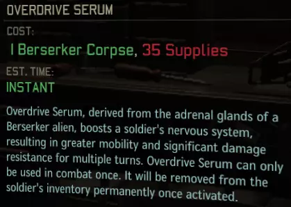 [3] 过载血清——持续2回合,激活无需消耗行动点。虽然我个人因为其消耗品性质不太倾向于使用它们,但它们的好处相当明显:在你真正需要的时候提供2回合的增益。当你还在建设阶段时,35补给品(和一具穆顿尸体)的成本有点高昂。然而,在战役后期,你可能已经拥有了大部分(如果不是全部)所需的东西,所以那时可能更值得花费这些成本。 建议:根据你的判断使用它们,只需知道每个血清花费35补给品。和任何物品一样,它们会占用空间……所以……也许你宁愿携带其他能在任务中提供超过两回合帮助的物品,或者两回合的超级英雄强化对你来说值得?这由你决定。