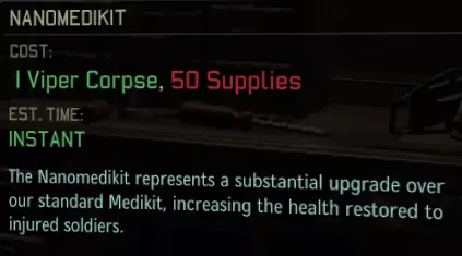 (一次性使用/任务——医疗专家技能下最多4次使用/任务,无冷却时间。持有者获得中毒免疫。) [2] 医疗包——常规版本可治疗4点生命值(升级后为6点),治愈中毒,并在士兵流血濒死时使其稳定。请注意,如果士兵在任务中受伤,即使你用医疗包将其治疗至满血,他们仍会被视为受伤状态,需要X天时间恢复(取决于伤势严重程度和游戏难度)。 建议:尽早建造一个。在我看来,只有装备了医疗协议(通过小精灵无人机远程治疗)和战地医疗兵(医疗包任务使用次数+2)的专家才值得携带医疗包。或者,如果你总担心中毒,我觉得要是没什么更好的装备,你可以戴上这个以防万一。