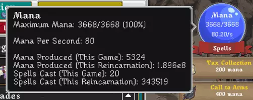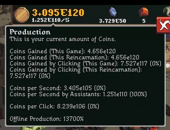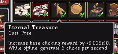 离线时,每秒钟获得的金币数量等于你在线(闲置)时的每秒金币产量乘以离线生产倍率,再乘以离线时长(秒数)。换句话说:离线时长(秒)×离线生产倍率×闲置每秒金币数。同样地,离线时获得的FC数量等于助手提供的每秒FC产量(约等于基础助手数量×FC发现概率×FC倍率,例如精灵的第四个技能【精灵使者】或中立佣兵的【贸易领主】)乘以离线FC概率(在撰写本文时的3.8版本中,该概率仅为三倍异常值)。离线时间(秒)×FC发现概率×FC乘数×三重怪异加成(乘数形式)×基础助手数量(将鼠标悬停在FC容器上可查看FC发现概率) 不过,大多数情况下,这没什么用,因为通过税收收集(带硬币掠夺奖杯/升级)或挖掘获得的FC在更短时间内会高得多。 自动点击 (我先提这个,这样后面就能一次性讲完所有与魔力相关的内容) 阅读为你自动点击的升级(如精灵血脉)的描述,如果你看到“离线时也会产生相同数量的点击”,那么该升级……嗯……离线也有效!无法离线生效的点击来源的典型例子是带有太阳祝福升级的月之祝福(精灵的法术),因为如你所知:法术无法离线生效。 但作为补偿,从坚固宝藏(花费500金币)到永恒宝藏(花费5Qa/5e16金币)的【宝藏】升级系列,每个都能在离线时为你提供1次/秒的点击,总计最多可叠加至6次/秒。