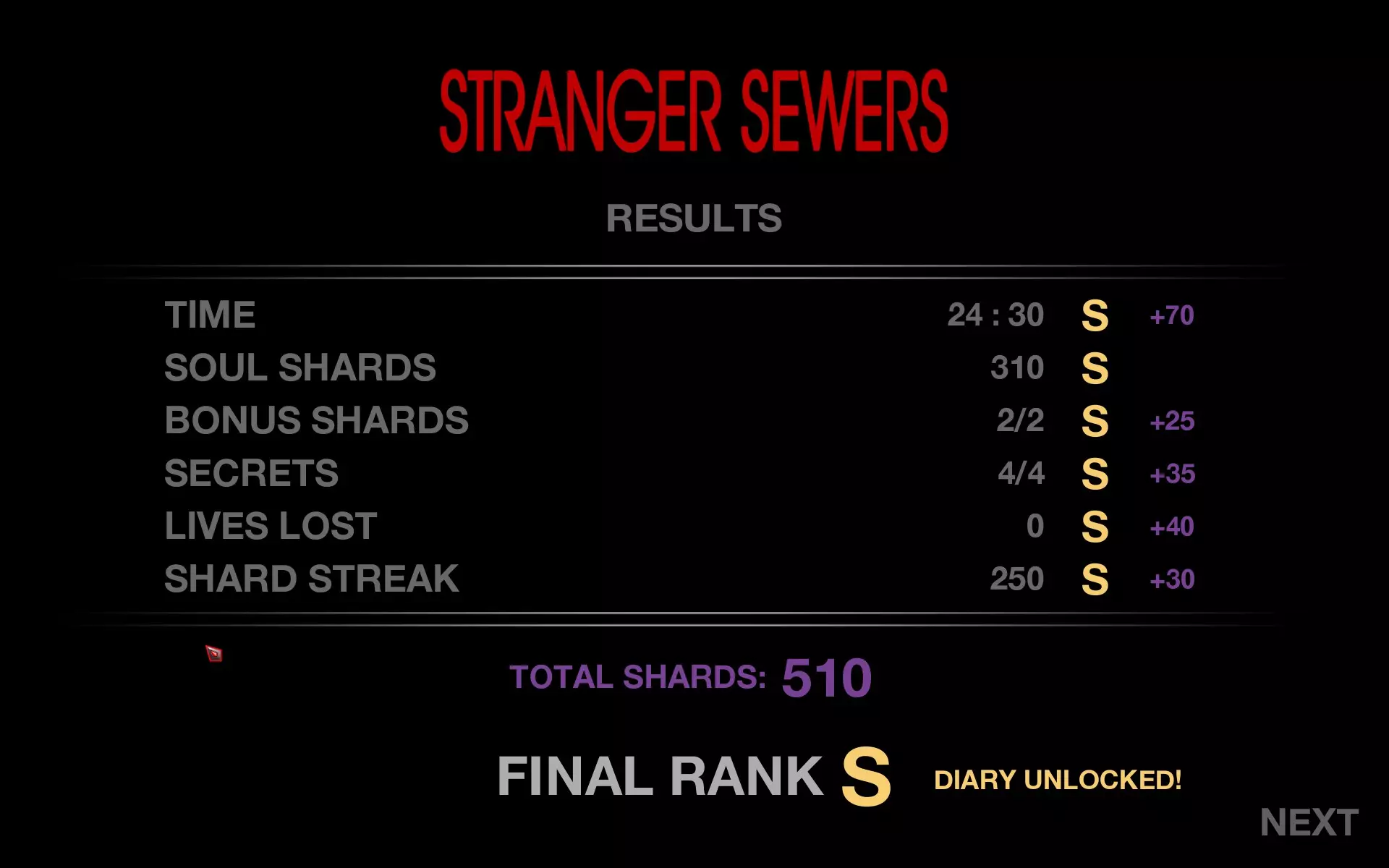 时间 少于25分钟 灵魂碎片 354 额外碎片 2/2 秘密 4/4 死亡次数 1次或更少 连续收集碎片数 250