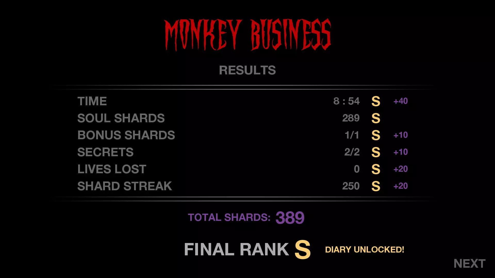 时间 少于10分钟 灵魂碎片 289 奖励碎片 1/1 秘密 2/2 失去生命 0(不允许死亡) 碎片收集连击 250
