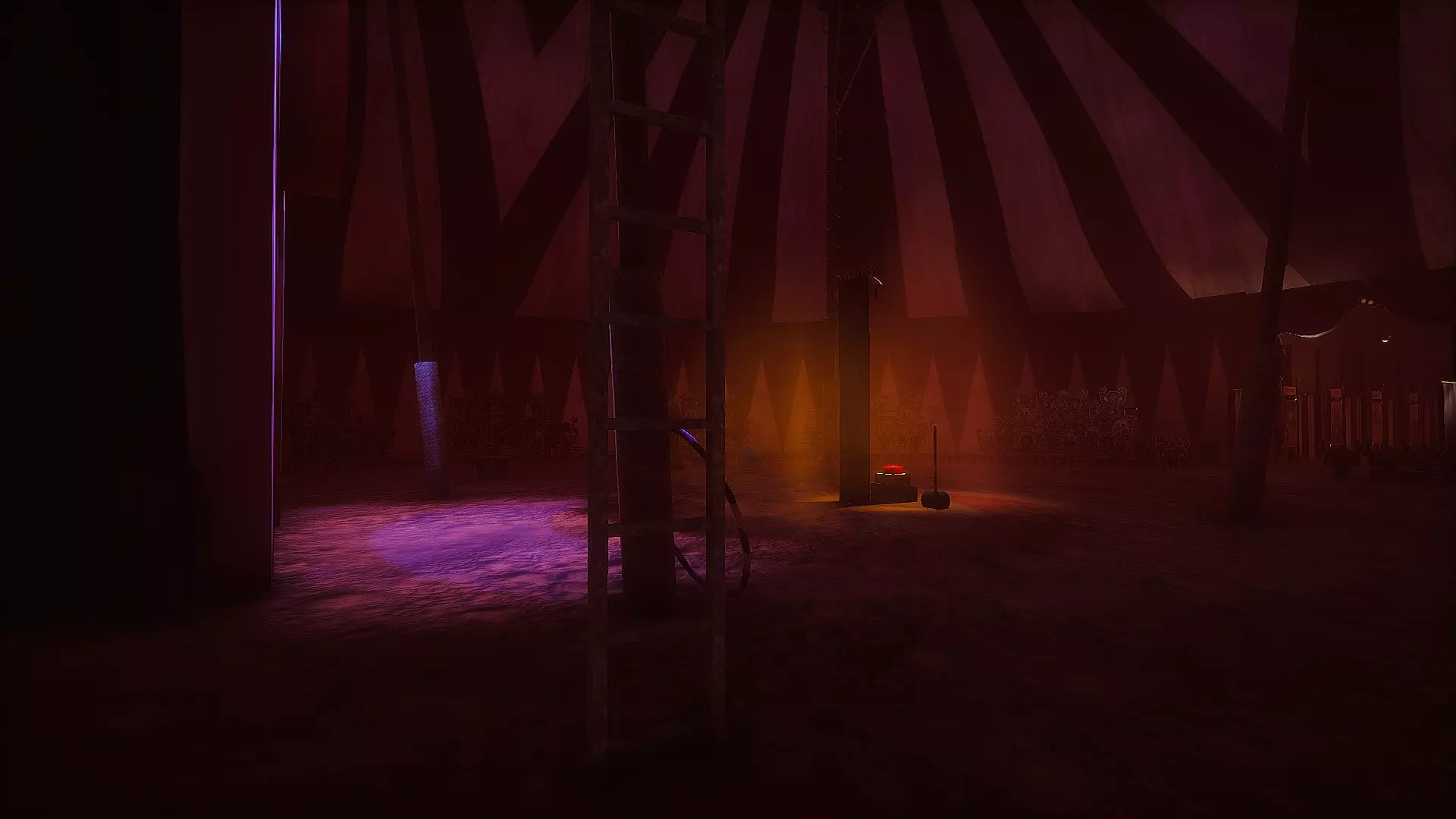 隐藏地点: 注意:有玩家反馈,若在特定时间获取本关卡的部分隐藏要素,可能无法正常记录为已收集状态。这也适用于与隐藏要素相关的红色碎片。因此,你需要在……时获取它们。秘密1:与锤子互动并开始播放视频前 秘密4:在区域2收集所有灵魂碎片前 引用自Loocik:当你被邀请进入大帐篷后,注意左边的楼梯。楼梯相当高,但一直爬到顶部,你会发现马戏团的第一个秘密。