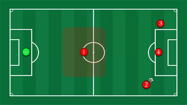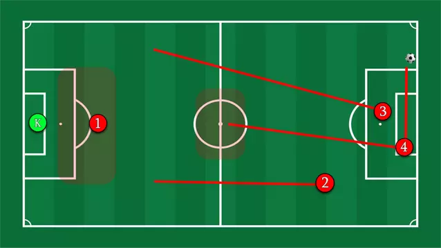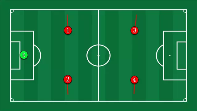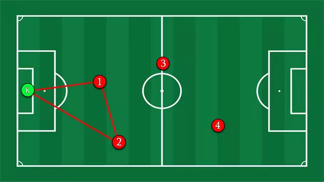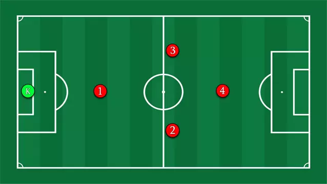 优点:防守应该更稳固。保持控球,万不得已时才传给1号球员或门将。我认为,当领先一两个球时,这个选择是合理的,但在比分持平或落后时绝不可用。 缺点:基本上是让4名球员在对方禁区附近孤军奋战,寄希望于运气。 你可以与队友形成三角配合来保持球的运转。
