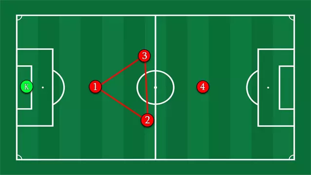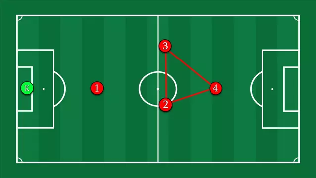 本质上,无球状态下的阵型变为3-1。 1-2-1 虽然不像1-3/3-1那样灵活,但1-2-1阵型为高控球提供了很好的选择。门将可以稍微放松一些,两名中场球员可以相互配合,或者更快地协助1名防守球员。