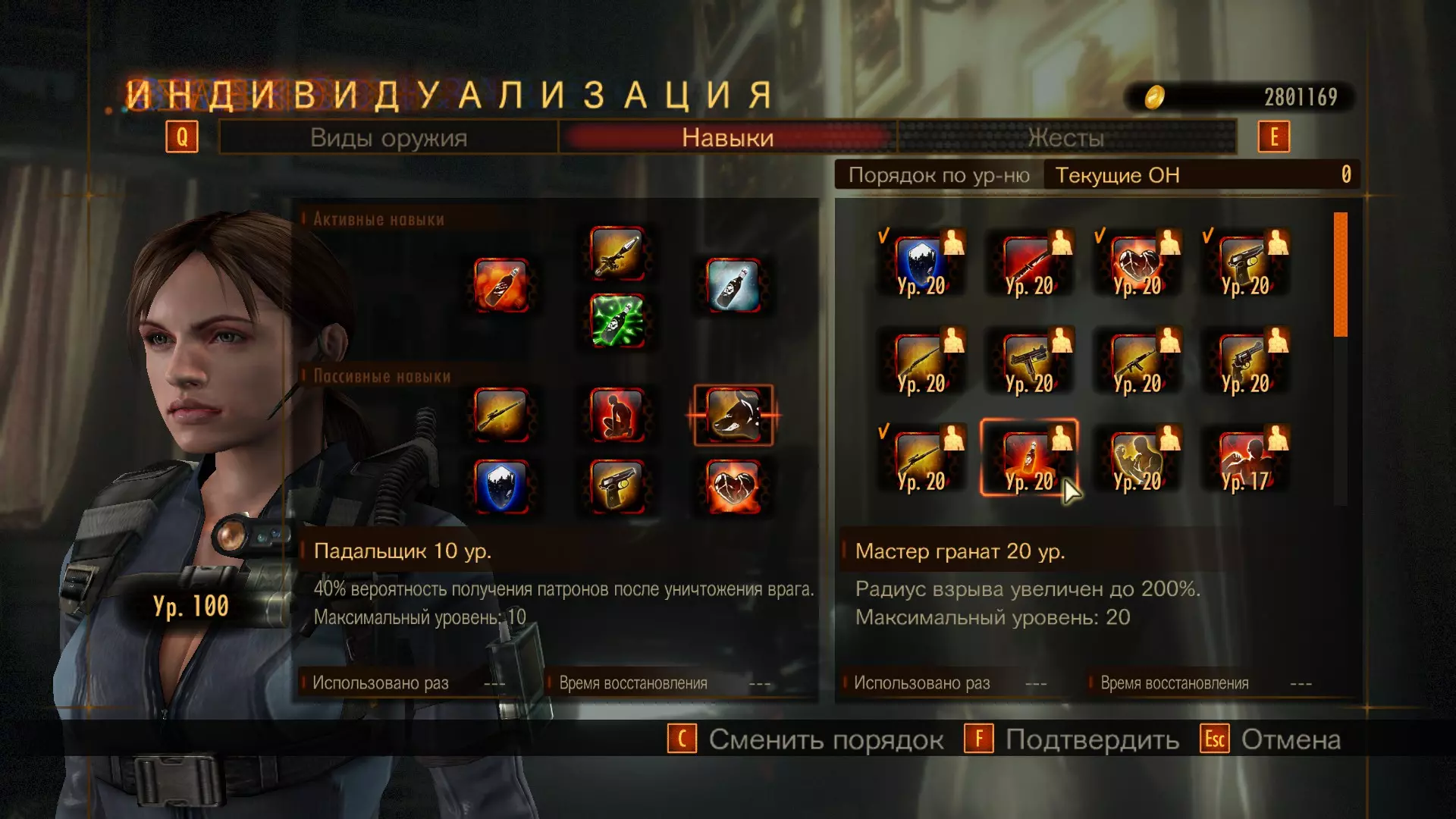 10. "Танцую". Два прихлопа, три притопа и прыжок. Приблизительно так и выглядит этот жест, который вызывает ассоциации с танцами на детских утренниках. Может быть получен за убийство врага навыком "Жестикуляция". 11. "Приступ гнева". Еще один жест родом из детства. Герой падает на землю и начинает в ярости дергать руками и ногами. Жест может быть получен за убийство четырех врагов дрелью. Уж не знаю по-одиночке или единовременно, так как я использовал второй вариант. 12. "Улюлю"... Эмм, я даже не знаю о чем они думали, когда называли жест вот так. Впрочем, не важно. Представляет он собой радостный прыжок в воздухе если бы юбки у ряда женских персонажей не были затемнены, то геймеры получили бы неплохой панцу-шот, но увы. Навык можно получить если пройти одну из миссий на красном уровне сложности с одним пистолетом. Сразу скажу - вам необходимо убрать из навыков все бутылки, ракетницы и иные вещи причиняющие непосредственный урон врагу. Также нужно убрать из инвентаря все оружие помимо пистолета. Игра очень параноидальна в этом плане. 13. "Ура!" Как я понимаю вам просто нужно получить на одной из миссий все пять медальонов. Сам жест из себя ничего особого не представляет - герой стоит на одной ноге простерев руку к небесам, но и получение этого навыка особых проблем не вызывает. 14. "Да". Будет получен за прохождение восьмой операции на уровне сложности трудный. Герой складывает руки таким образом, чтобы получилась буква О. 15. "Нет". Пройдите операцию 2 на уровне сложности очень трудный. Герой складывает руки крест-накрест. 16. "Камень", "Ножницы", "Бумага". Бесполезные жесты, ведь вы сами выбираете какой из них будет использован, а потому подловить партнера не получится. Ну да ладно. Могут быть получены за прохождения операций 1, 3, 5 на очень сложном. 17. "Не да, а нет". Ничем особым от жеста под пунктом 15 не отличается. Может быть получен за прохождение операции 4 на очень трудном. 18. "Да уж". Радостный прыжок. Получаем за прохождение всех миссий на уровне сложности Красный. 19. "Поза героя". Самодовольная поза, отчего так и хочется врезать герою, вот честно. Получаем за прохождение девятой операции. 20. "Разогрев". Потягушечки после утомительной работы в офисе. Получите, как только Клер достигнет 50-ого уровня. 21. "Соло на гитаре". Название говорит само за себя. Получите, когда достигните Леоном 50-ого уровня. 22. "Смех 1". У героя случается эпилептический припадок, что не удивительно, учитывая как мы получаем этот навык. Нужно за Альберта Вескера получить 50-ый уровень. 23. "Я недостоин". Поза характерная для самурая, когда он опозорился. Разве что харакири себе не делает. Получаем за шифра по достижению 50-ого уровня. 24. "Не знаю". Также говорящий жест. Получаем за Джил по достижению 50-ого уровня. 25. "Аплодисменты" - вам выпала редчайшая возможность насладиться профессиональной работой аниматоров и дизайнеров данной игры. Персонаж начинает аплодировать, вот только пальцы не сложены вместе, отчего подобный жест выглядит забавно. В первый раз. Потом он смотрится ущербно. Можно получить, достигнув Алекс 50-ого уровня. 26. "РЖУНИМОГУ" - нет, это не ошибка грамматики и не любовь к капслоску автора сего руководства. Жест и впрямь так обозначен. Вот только героям явно не до смеха. Персонаж падает на спину и его правая нога начинает нервно подрагивать, давая понять, что скорая тут бы не помешала. Получ