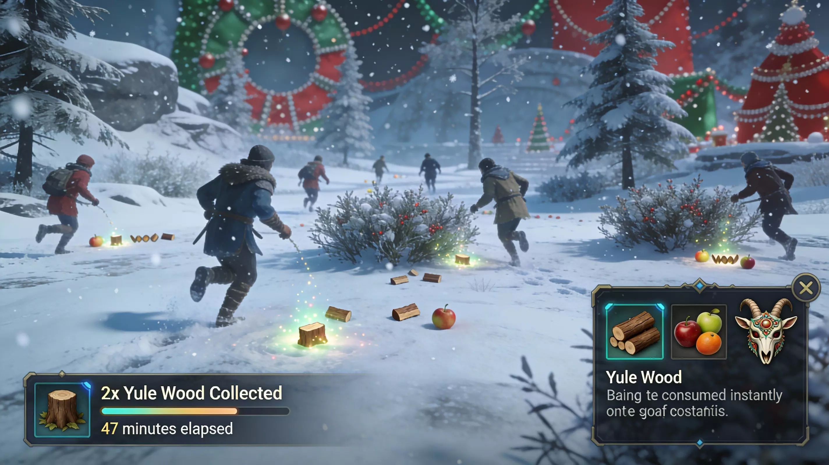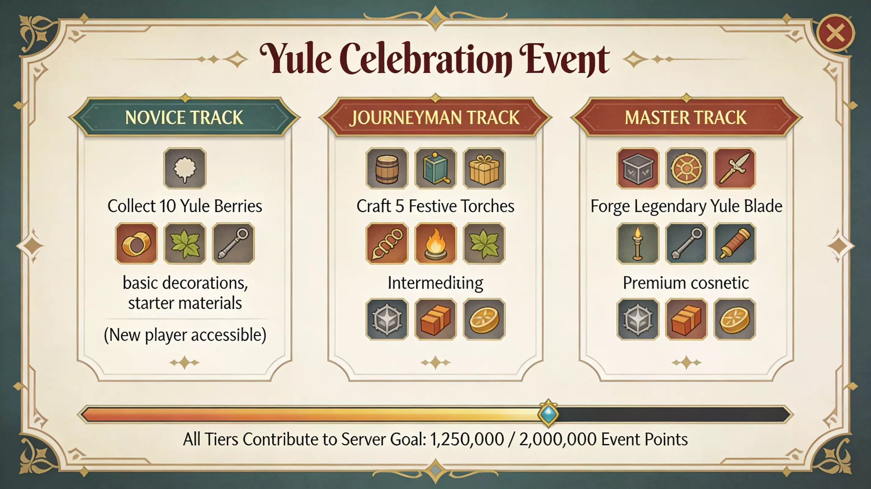 “与社区共同打造,而非对社区发号施令——共同创造需要倾听的循环,而非单向的公告周期。” 在我们处理核心系统的同时,也必须正视社区参与度的差距。这次“大师锻造”公告感觉就像是在流血的伤口上贴个创可贴,然后就称之为更新。你们并没有让社区参与到共同创造中——没有“工匠们需要什么?”的讨论帖,没有测试反馈循环,没有社区驱动的活动,也没有服务器级别的锻造目标来解锁新区域。你们是在对我们说话,而不是与我们对话。再这样下去,你们终将面对空无一人的房间。 【尤尔节活动:错失良机的案例研究】 尤尔节活动(2025年12月17日-2026年1月13日)是游戏内的首个季节性庆典。它带来了什么呢?一条用于收集活动材料的魅力项链、部分装饰物品(山羊面具、皇冠、灯笼)以及专属配方。它未能提供的是:有意义的游戏玩法参与度、新玩家可接触的内容,或是与投入时间成正比的奖励。