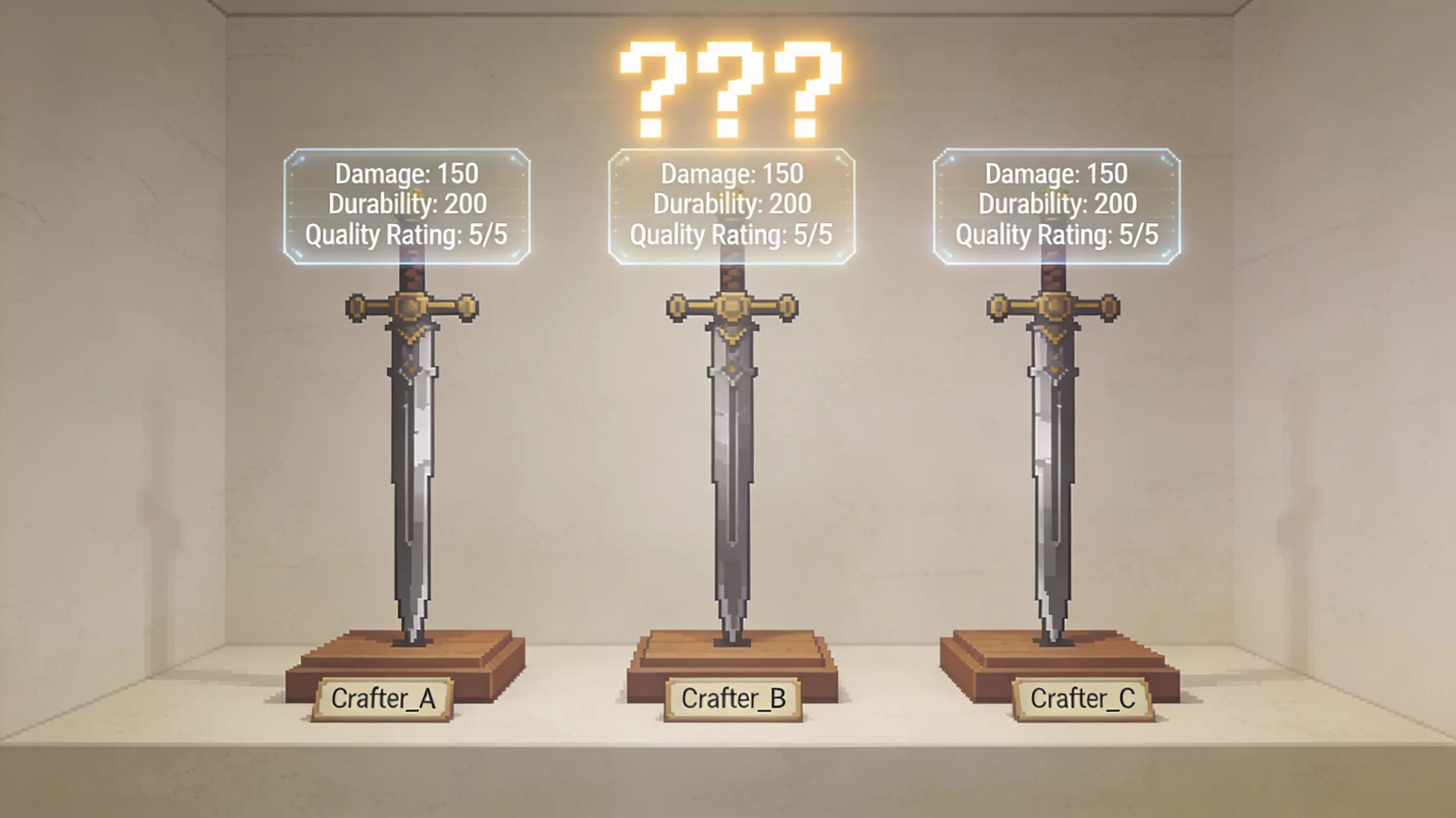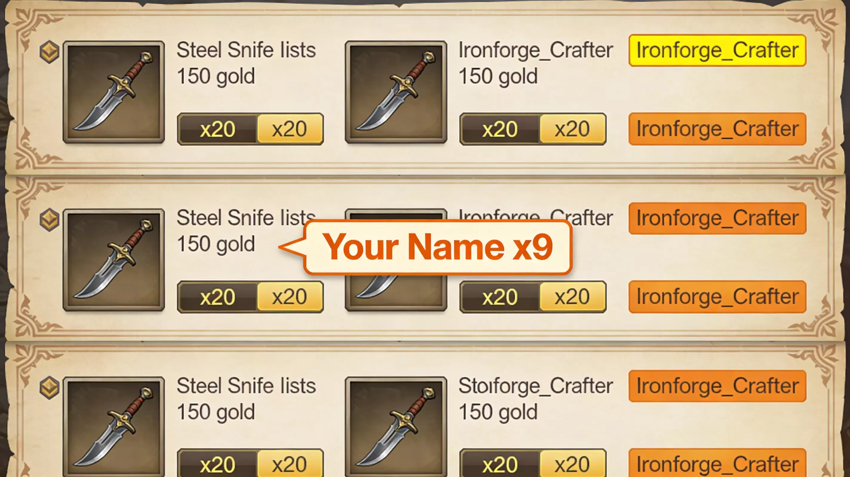 强制要求工匠名称必须显示?这是为了什么——防止漏洞利用?还是市场透明度?这么做的结果就是,当我出售90把钢制匕首时,我的名字会被贴满三页市场列表。我的名字,每页三次,总共九次。恭喜,你们成功发明了垃圾信息。