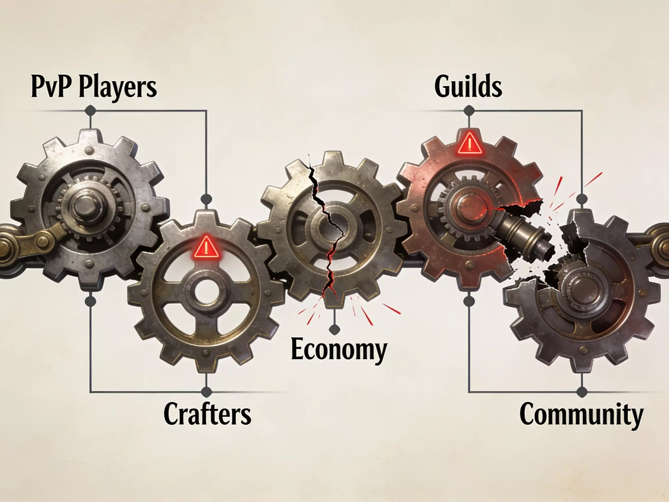 PVP玩家需要工匠→工匠需要经济尊重→经济需要内在价值和资源回收→公会需要实用的权限系统→社区需要参与度 现在的情况是:工匠因时间不被尊重和没有投资回报而感到疲惫。经济系统濒临崩溃,因为刷怪比制作更划算。由于权限设置问题,公会存在风险。社区参与度下降,因为缺乏共同创造的机会。解决其中一个问题,其他问题就会随之稳定。 如果忽视这些问题,你那些嗜血的军阀们最终将只能穿着简陋的遮羞布四处游荡,而服务器也会逐渐变得空无一人。