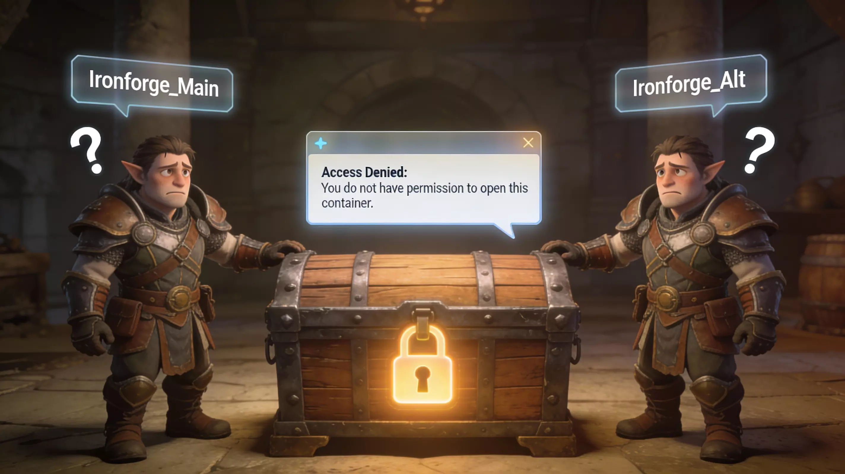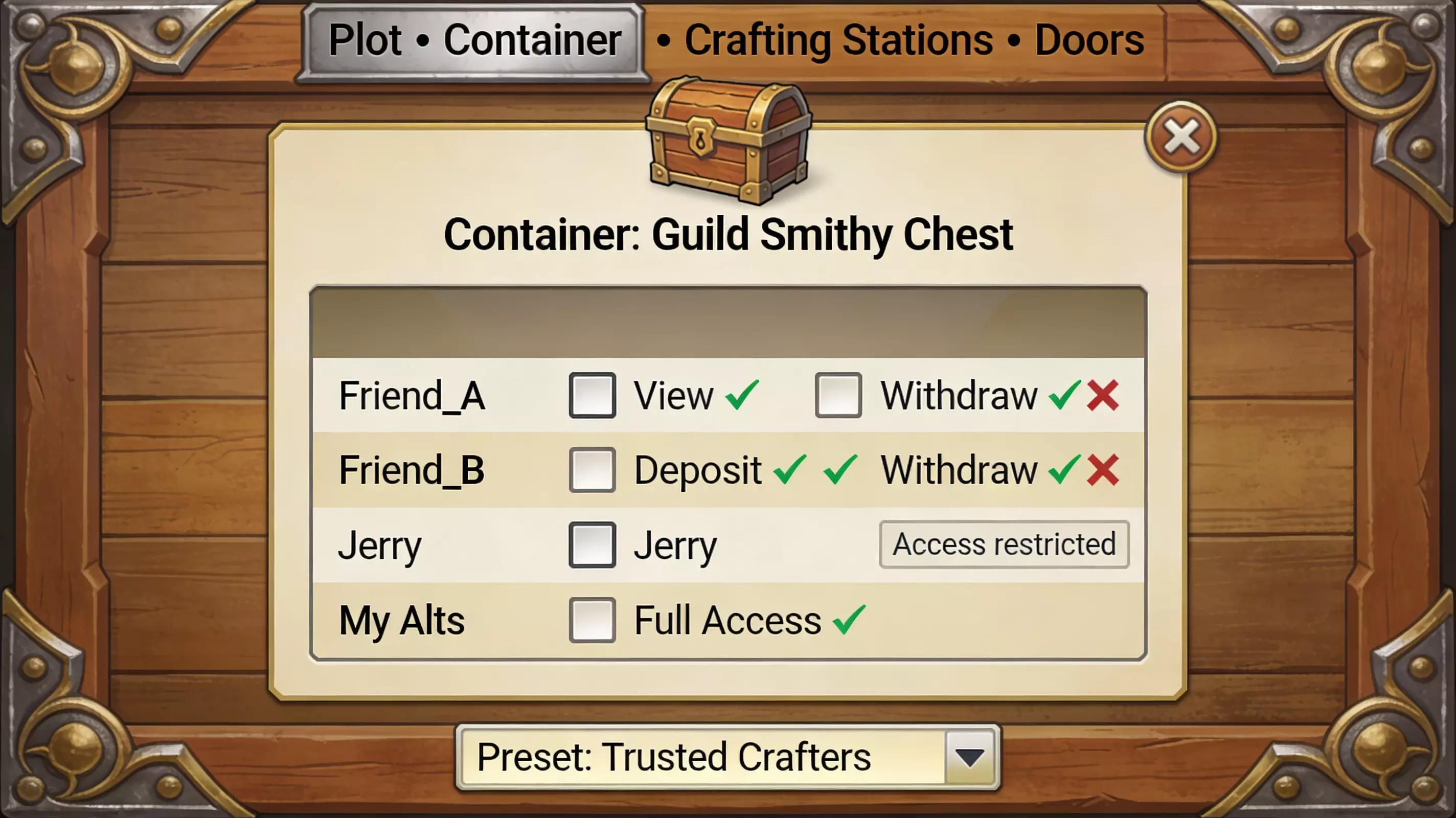 然后是权限系统。说实话,这就是我虽然加入了公会却依然选择独来独往的原因。我无法在不将所有内容公开的情况下与朋友共享一块地皮。我不能只让某个特定的朋友访问单个容器。我甚至不能允许我的小号打开我自己的箱子。我的小号,我的箱子,却打不开。 这意味着我无法建立社区基础设施,因为可能会出现这种情况:杰瑞喝多了,以为自己在帮忙,结果用掉了所有的钢条去制作铁砧。坏杰瑞,回去睡觉。解决办法是精细化的访问控制列表——按地皮、按容器、按好友列表设置权限。单人玩法的可行性并不意味着反公会,而是意味着风险缓解。让玩家能够建立信任网络,而不必被迫处于脆弱状态。这是基本的社交设计。