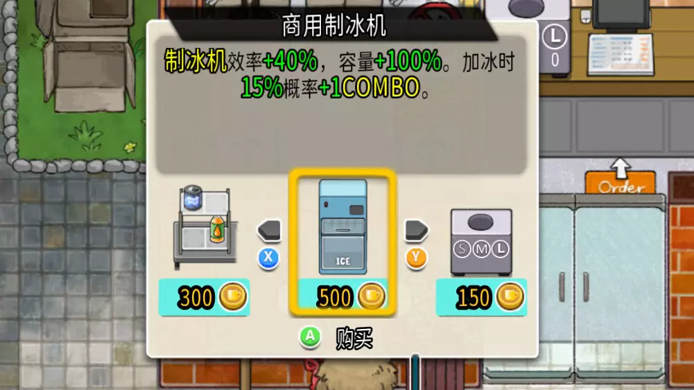 具体操作情况 我已经解锁了全部【补充资金】的家具,初始杯币为900。现在在【设备升级】(恶魔那里)购买【商用制冰机】,花费500杯币。(如果一开始没刷到就只能放弃店铺重来T T)